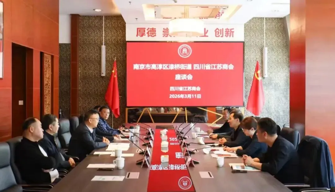 2026年3月11日下午,南京市高淳区漆桥街道党工委书记徐进率队到访四川省江苏商会,双方围绕招商引资、产业对接、文旅融合等议题开展座谈交流。