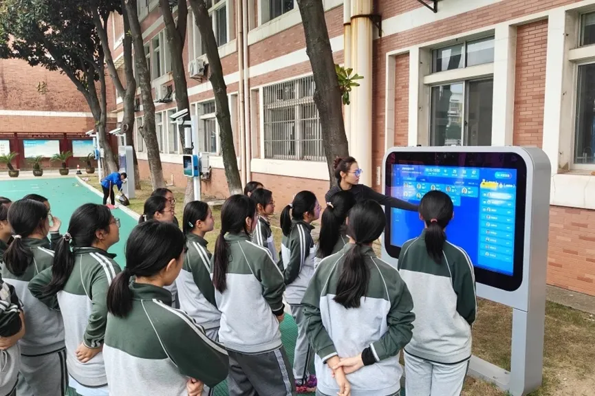 大课间铃声响起,南京市陶行知学校八年级王同学和小伙伴们一路小跑到智慧跳绳区开启挑战,摇绳、跳跃……时间到!大屏系统实时显示挑战者姓名和排名。“年级第7,我又上升三个位次啦!” 王同学开心地说。