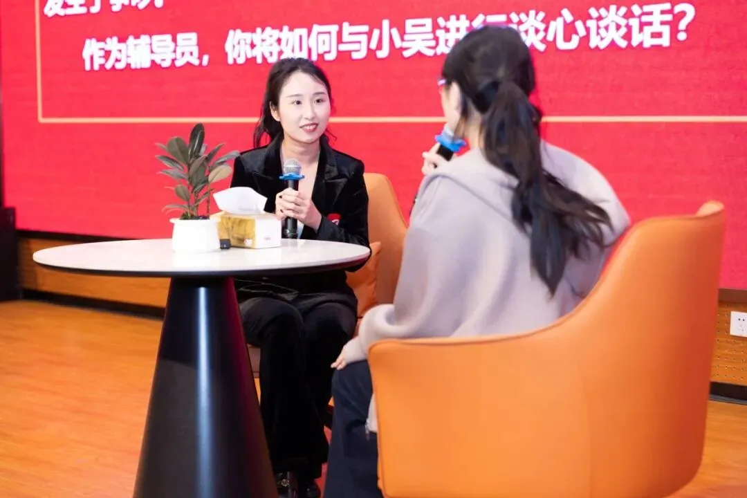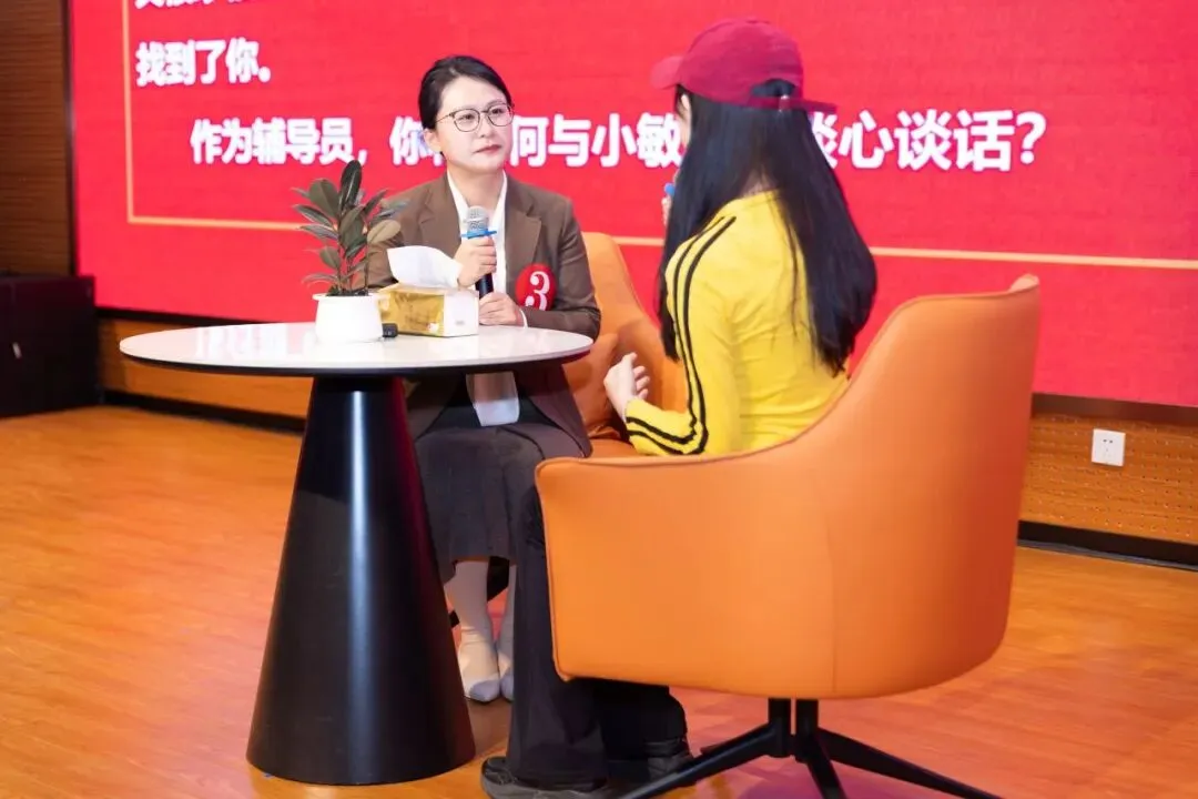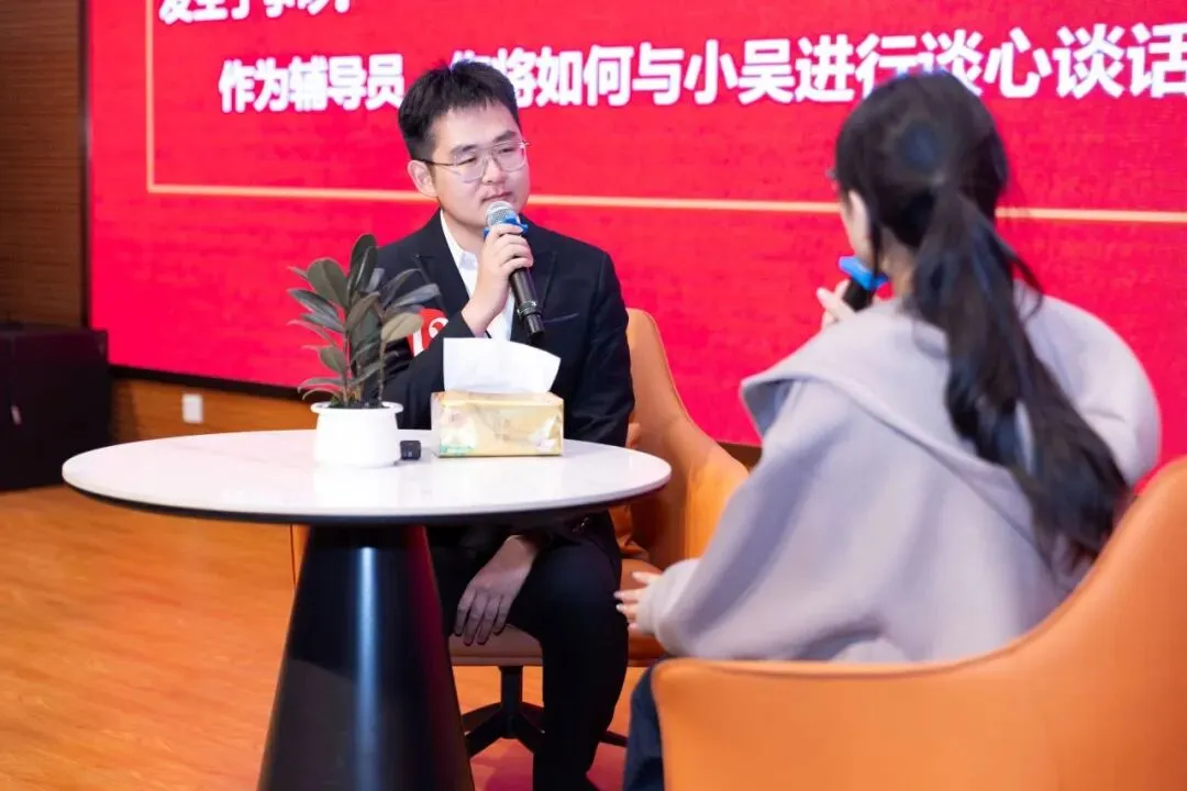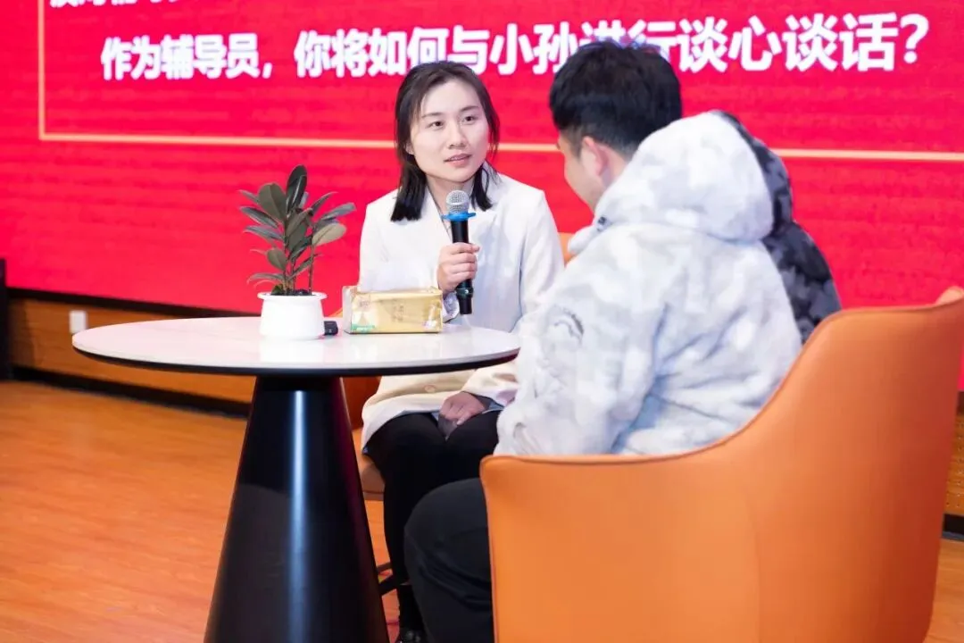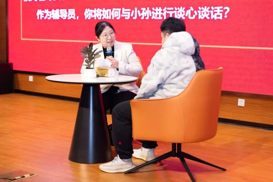 简短的休息之后,进入春风化雨的谈心谈话环节。12名选手提前 10 分钟抽取谈话题目,按抽签顺序依次上场,面对学生学业压力、亲子关系紧张、情感困惑、心理危机等真实案例情景再现,与学生扮演者展开 8 分钟沉浸式沟通。各位选手因势利导、紧扣关键,将思想引领、价值引导与解决实际问题深度结合,用共情沟通化解学生困惑,用专业引导传递育人温度;谈话结束后,选手在 1 分钟内快速总结谈话中的问题并梳理改进措施,展现出辅导员队伍独有的能谋善断、春风化雨。