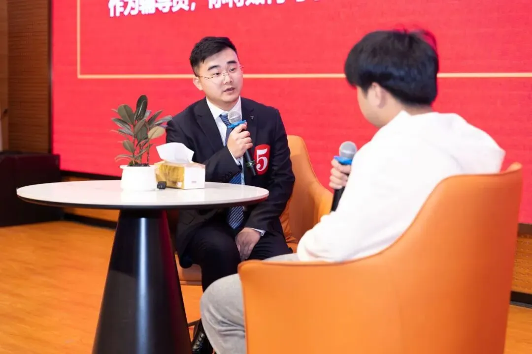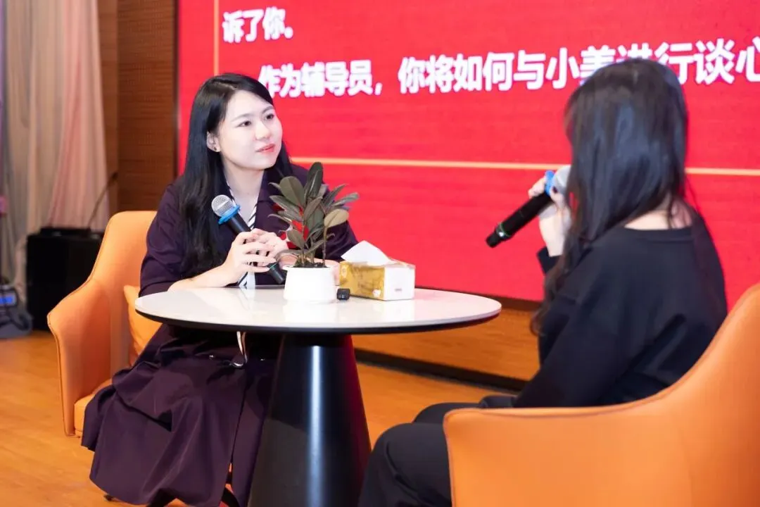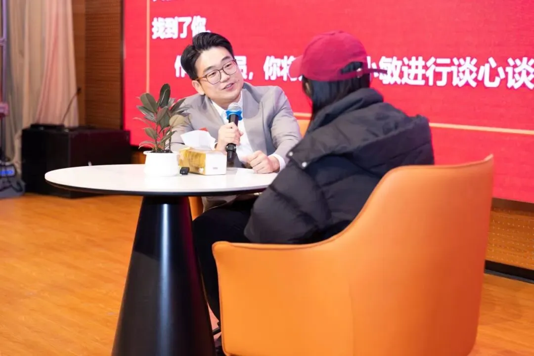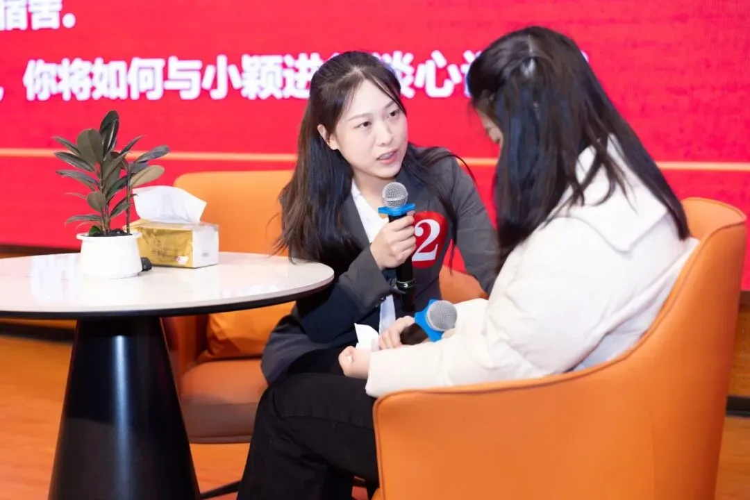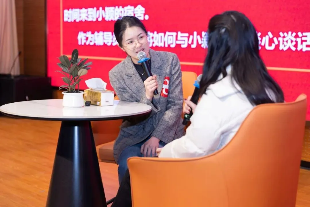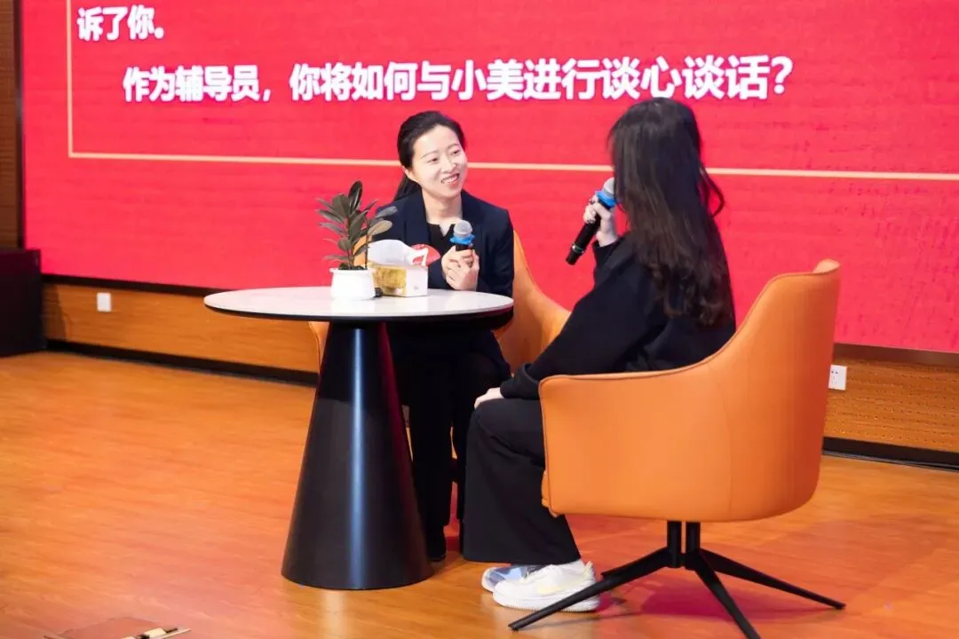 简短的休息之后,进入春风化雨的谈心谈话环节。12名选手提前 10 分钟抽取谈话题目,按抽签顺序依次上场,面对学生学业压力、亲子关系紧张、情感困惑、心理危机等真实案例情景再现,与学生扮演者展开 8 分钟沉浸式沟通。各位选手因势利导、紧扣关键,将思想引领、价值引导与解决实际问题深度结合,用共情沟通化解学生困惑,用专业引导传递育人温度;谈话结束后,选手在 1 分钟内快速总结谈话中的问题并梳理改进措施,展现出辅导员队伍独有的能谋善断、春风化雨。