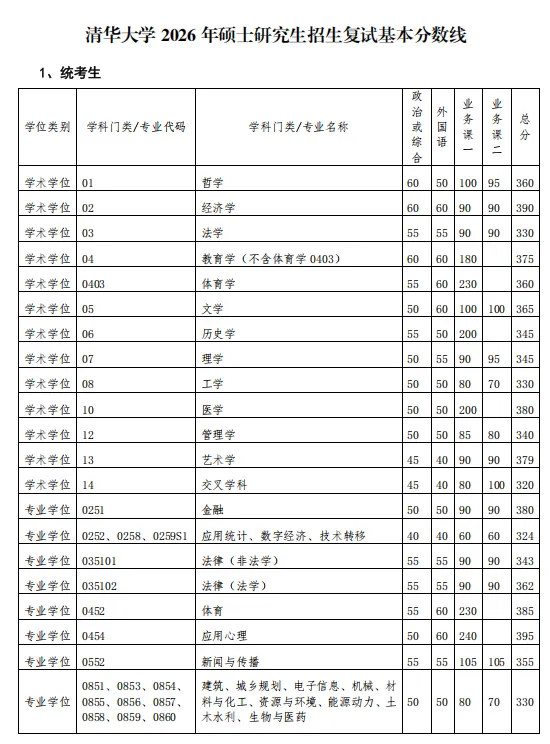 来看清华大学2026年复试分数线: