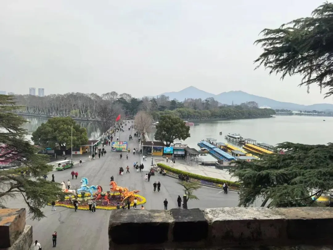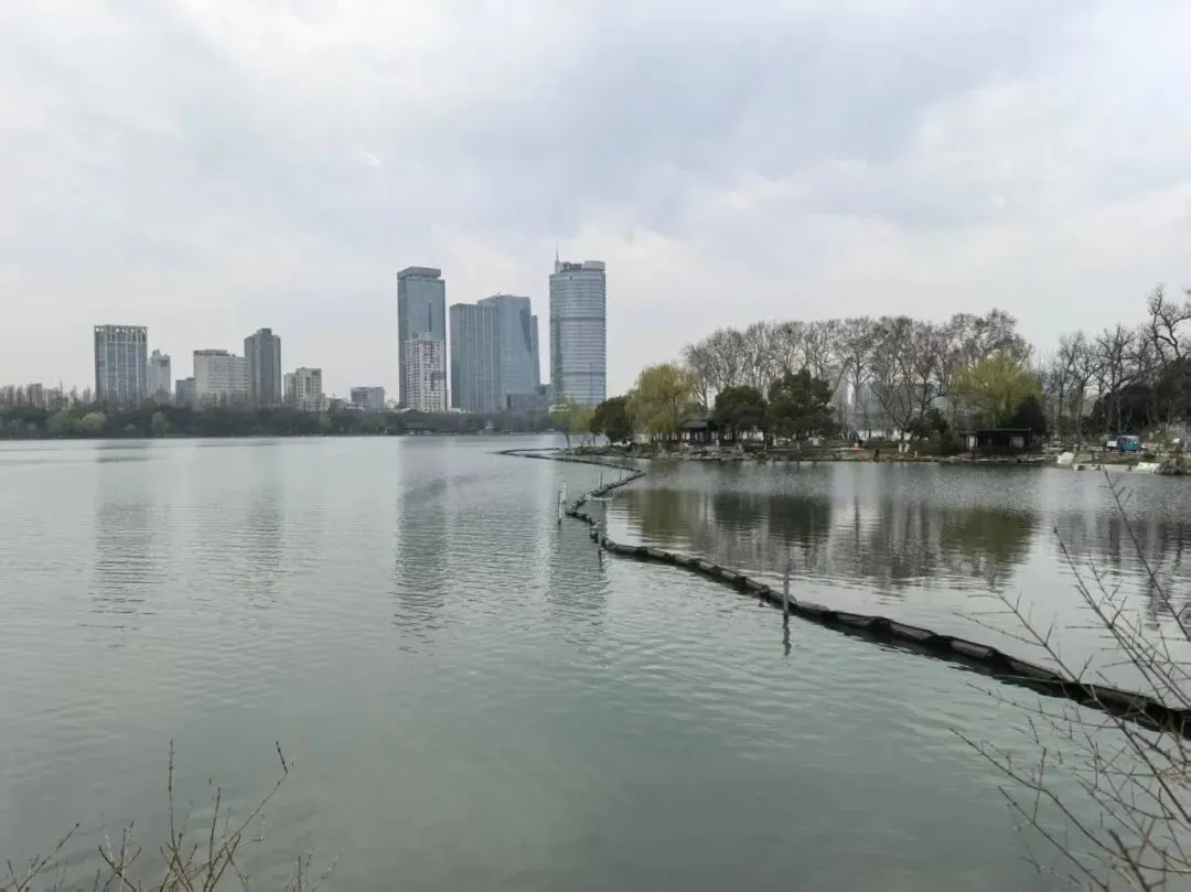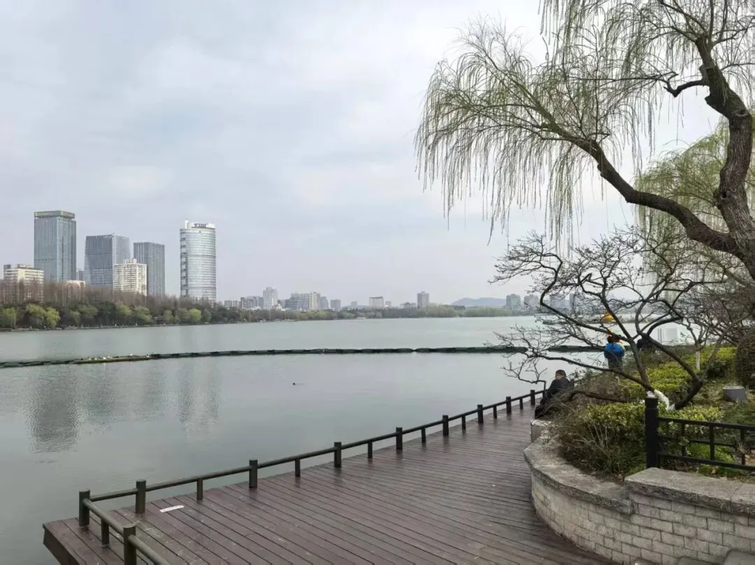 步入环州,我的脚步循着湖岸,毫无目的地向那柳烟深处漫溯。我是先从环洲去的梁洲,再去翠洲,然后折返,复去樱洲、菱洲。沿着翠虹堤一路向前,穿过“米芾拜石”,越过芳桥,便上了梁洲。洲上有闻鸡亭,有览胜楼,据说南唐时候,这里曾是文人雅集之地。洲上高大的银杏树早已卸下了那一身“黄金甲”,孤独地耸立在那条道路的两侧。梅花早已过了最盛的时节,但仍有几株晚梅,疏疏落落地开着,暗香浮动,透着一种清冷的风骨。那株“明代古梅”,树干苍劲嶙峋,虬曲如龙,树皮皴裂得像老人脸上的皱纹,底部的梅桩几近枯干,却从枯裂处迸出点点新绿。我伸手轻轻触碰着那粗糙的树皮,仿佛能感受到那六百年的风霜雨雪,宛如时间的脉搏,在这古木的躯体里缓缓跳动。