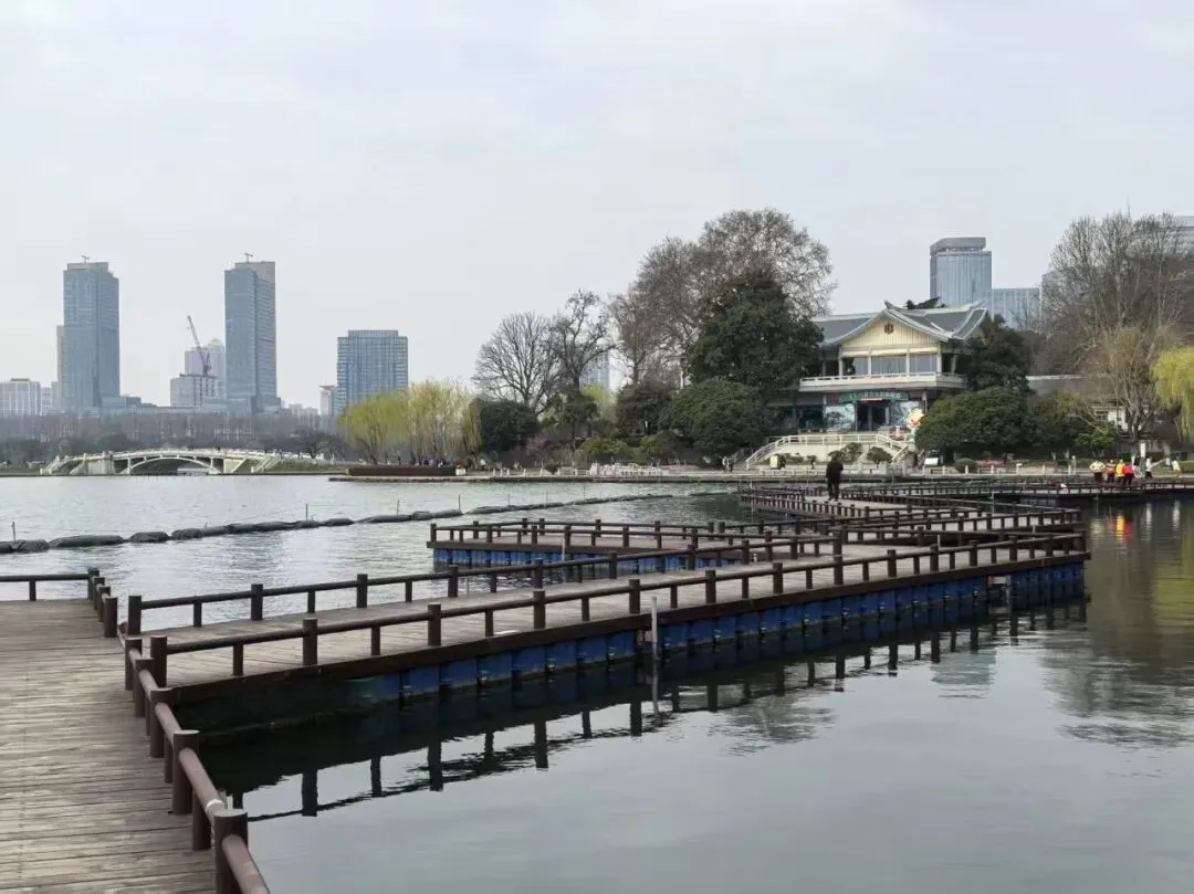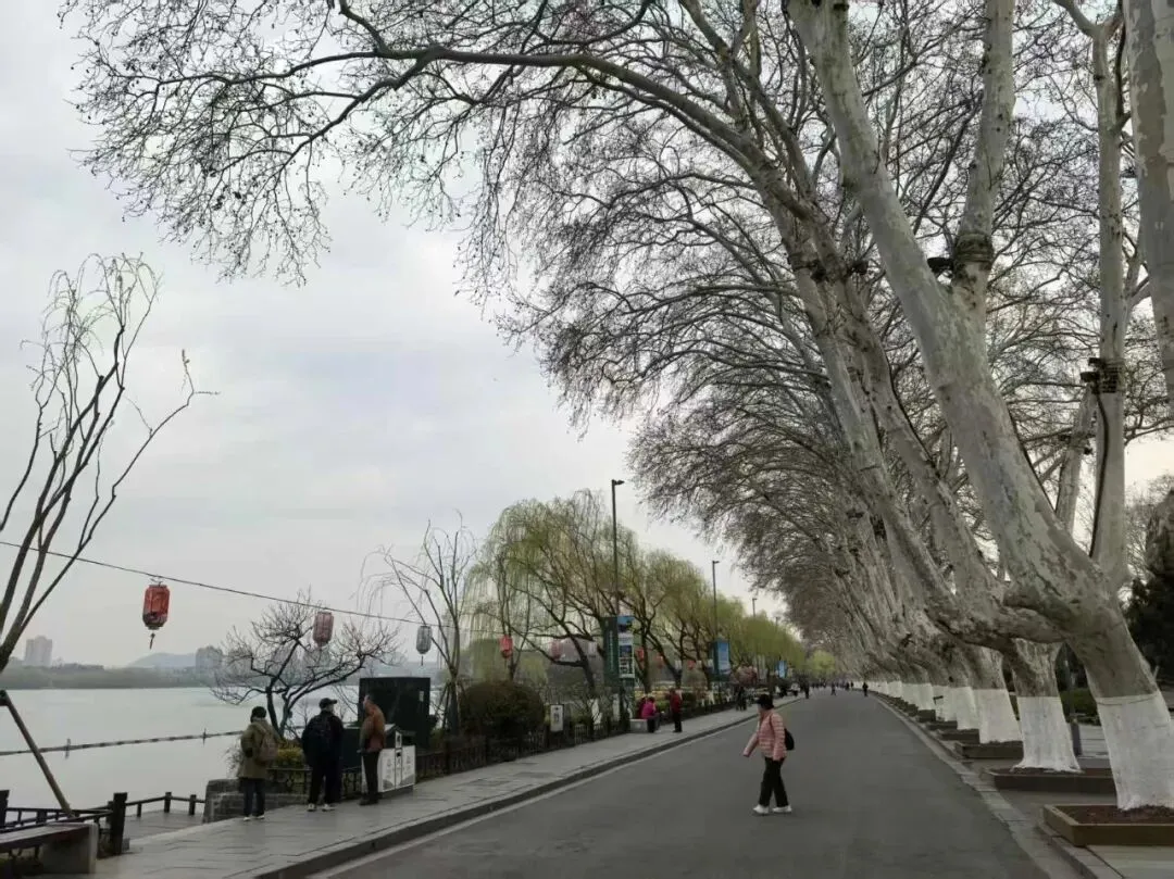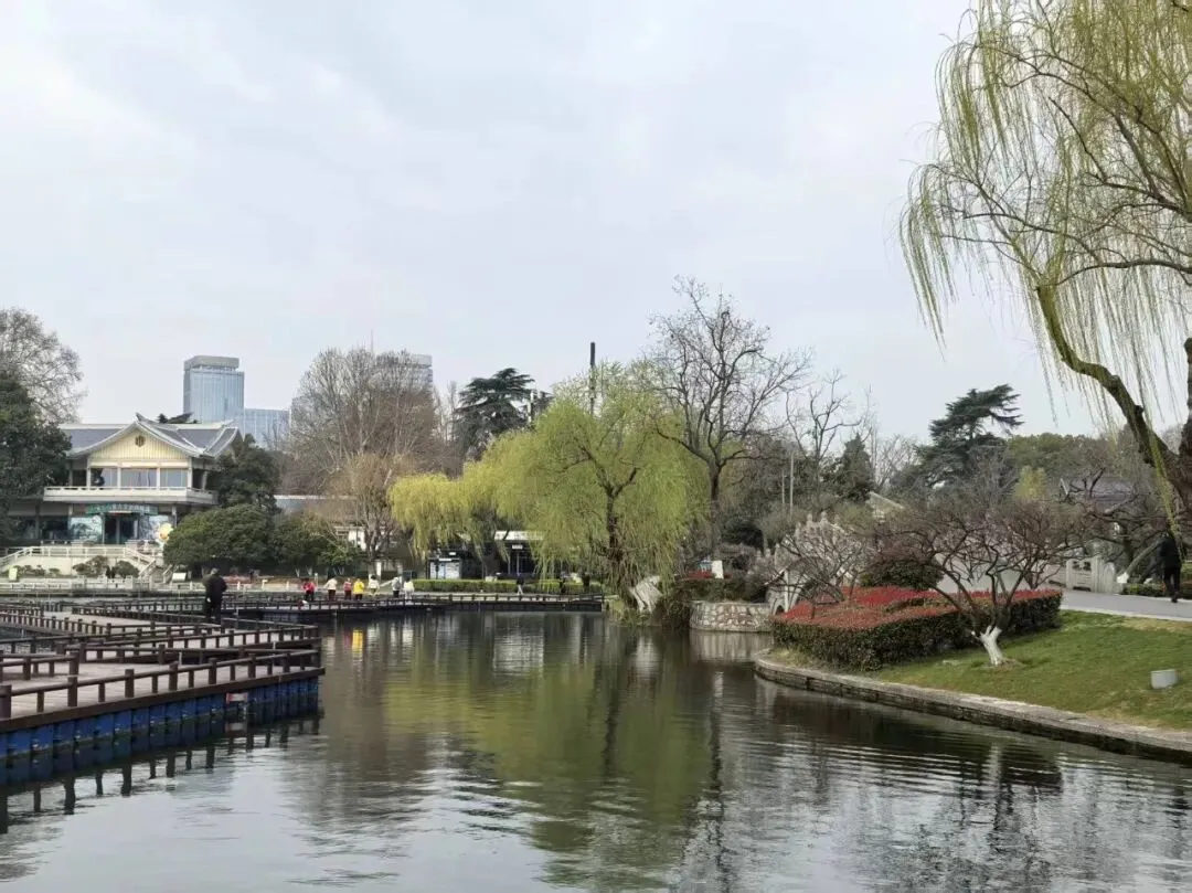 或许是因为早春,也并非节假日的原因,园内的游客三三两两的,并不算多。翠虹堤两侧高耸的梧桐,枝桠依然干枯着,光秃秃的,透着几分萧索。游船静静地停靠在船坞里,整个湖面一片静谧,只是泛着粼粼的波光,几只野鸭,悠闲地在湖心游弋,身后拖曳出两道浅浅的水痕,随即又消失在广阔的碧波里。唯有那湖畔的万条垂柳,纤细柔长,染着鹅黄嫩绿的春色,慵懒地垂向水面,微风一吹,袅袅地拂动着,透着早春的勃勃生机。