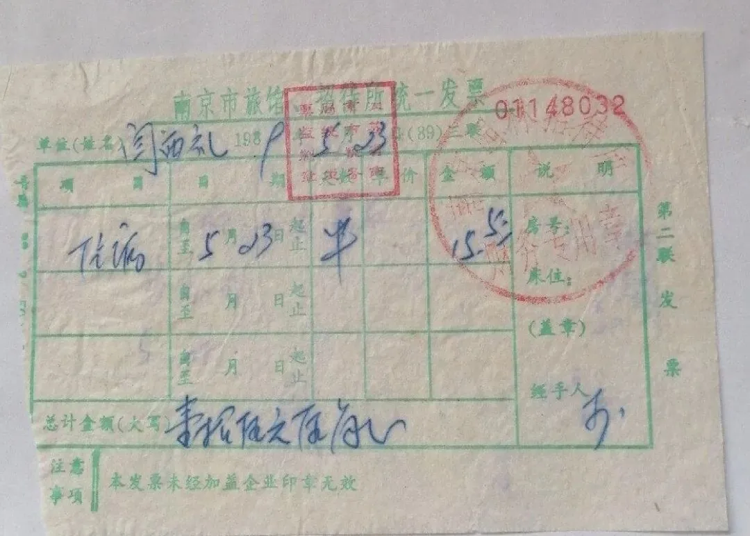 17.1989年,盖有南京园林招待所财务专用章的发票。