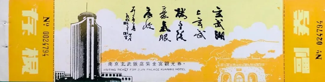 我收藏的这枚门票横版,左边是烫金色玄武饭店外型简图,背景是玄武湖湖景,五洲横弋,亭台掩映,小桥流水,湖光山色,尽收眼底。右边是南京明城墙之玄武门门楼。中间是我国著名书法家费新我题字“玄武湖上玄武楼,金陵豪气眼底收”。