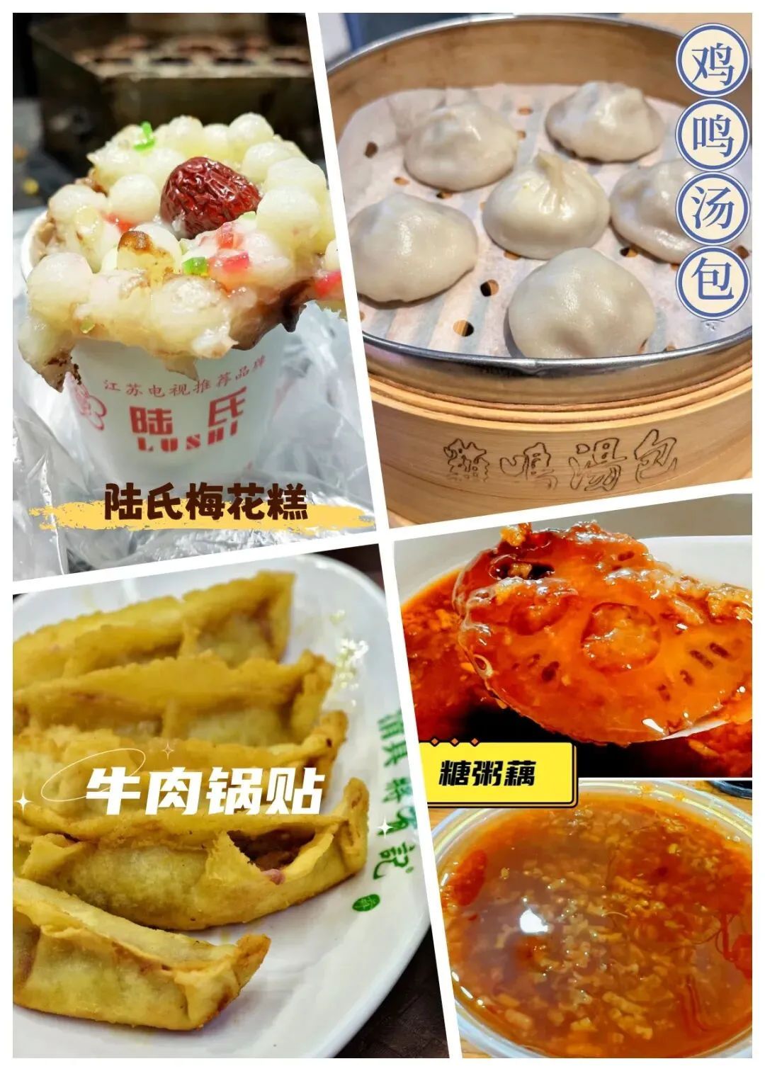 这里聚集了南京最地道的小吃:蒋有记牛肉锅贴、陆氏梅花糕、蓝老大糖粥藕、鸡鸣汤包。