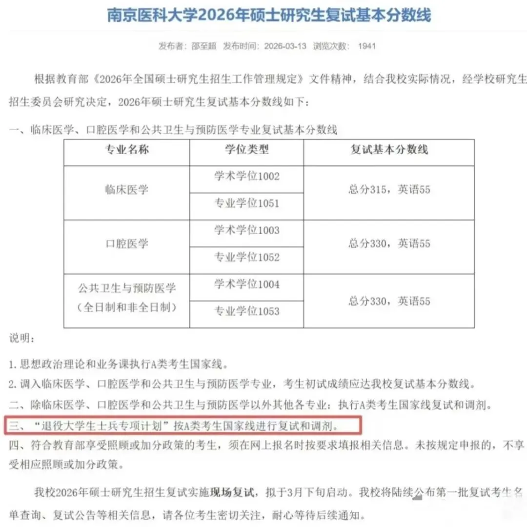 根据南京医科大学2026年硕士研究生复试分数线公告:
