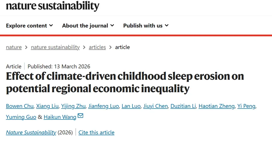 南京大学大气科学学院王海鲲团队探讨了未来由气候驱动的睡眠减少所引发的儿童认知能力下降在全球与区域层面的潜在经济成本。