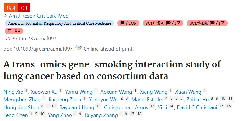 Xie N, Xu X, Wang Y, et al. A trans-omics gene-smoking interaction study of lung cancer based on consortium data. Am J Respir Crit Care Med. Published online January 23, 2026. doi:10.1093/ajrccm/aamaf097