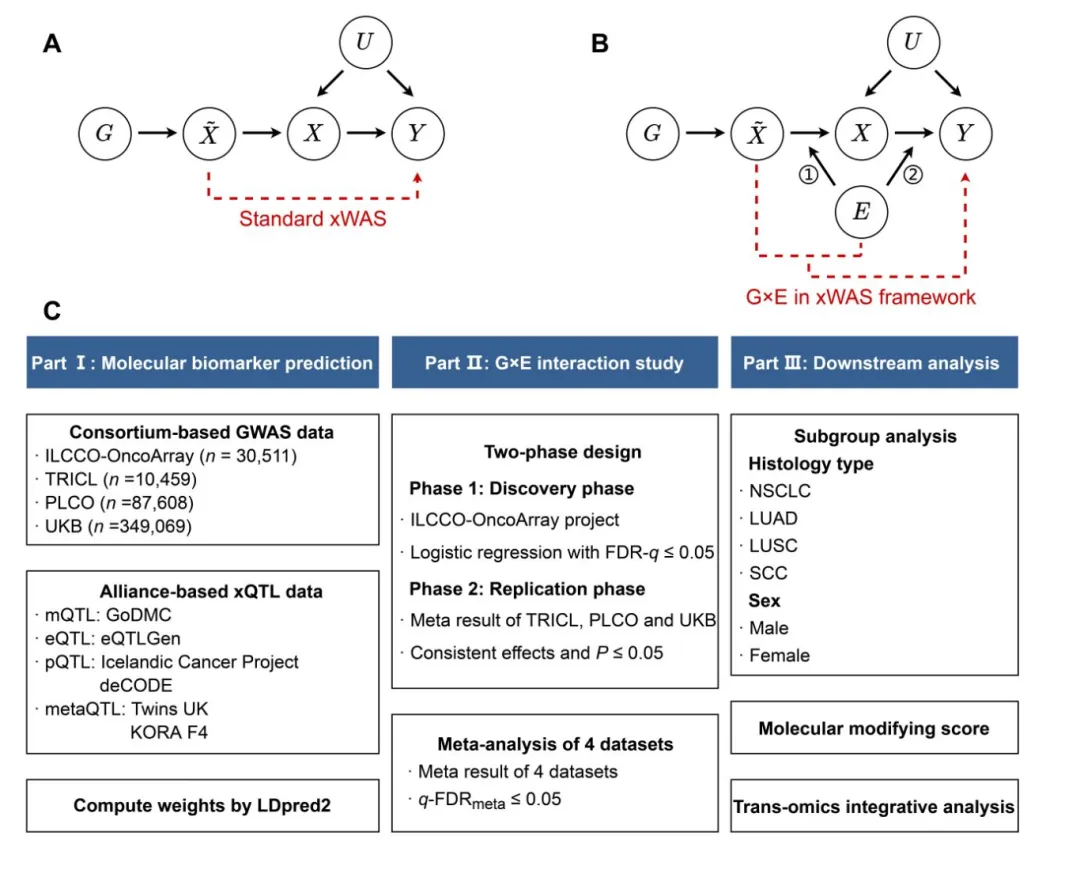 研究基于 xWAS 框架系统鉴定影响肺癌发病风险的跨组学基因 - 吸烟交互作用,明确修饰吸烟致癌效应的关键生物标志物,这种“基于 xWAS 框架的跨组学基因 - 环境(G×E)交互作用”的研究思路。