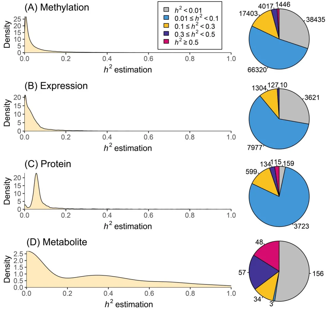 本研究最终纳入经严格质控的欧洲血统无亲缘关系受试者,包含 27737 例新发肺癌病例与 449910 例非病例对照,病例组吸烟暴露水平显著高于对照组;成功预测四大组学分子表型,超 70% 标志物遗传度达标,最终保留十余万个可靠标志物用于后续交互作用分析。