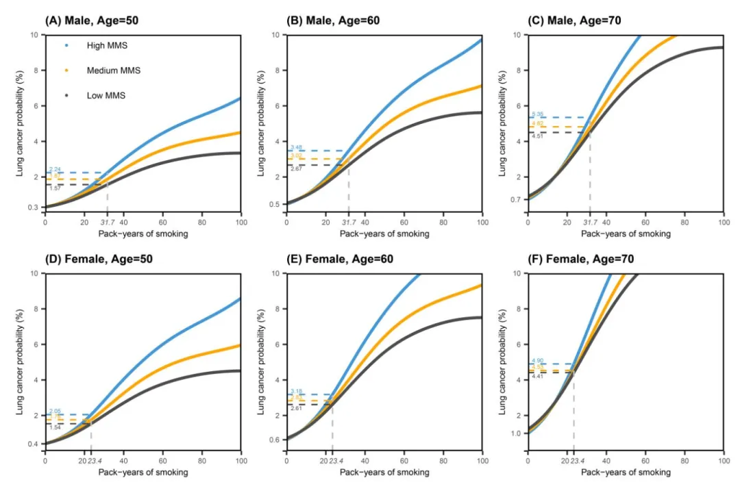 研究基于 5 个相对独立的核心交互标志物,以 meta 分析效应系数为权重,首创构建分子修饰评分(MMS);该评分可在校正年龄、性别后有效对吸烟人群进行肺癌风险分层,高 MMS 组肺癌风险显著更高,吸烟包年数越高组间风险差异越显著,同分层下女性吸烟相关肺癌发病风险略高于男性。