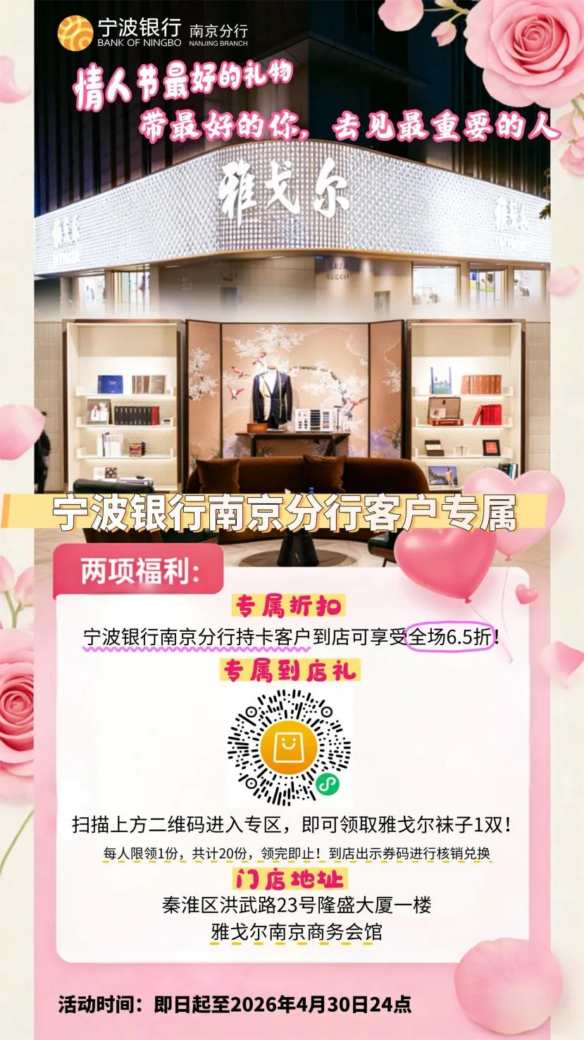 雅戈尔南京商务会馆为宁波银行南京分行持卡用户定制专属折扣福利!详见海报信息。