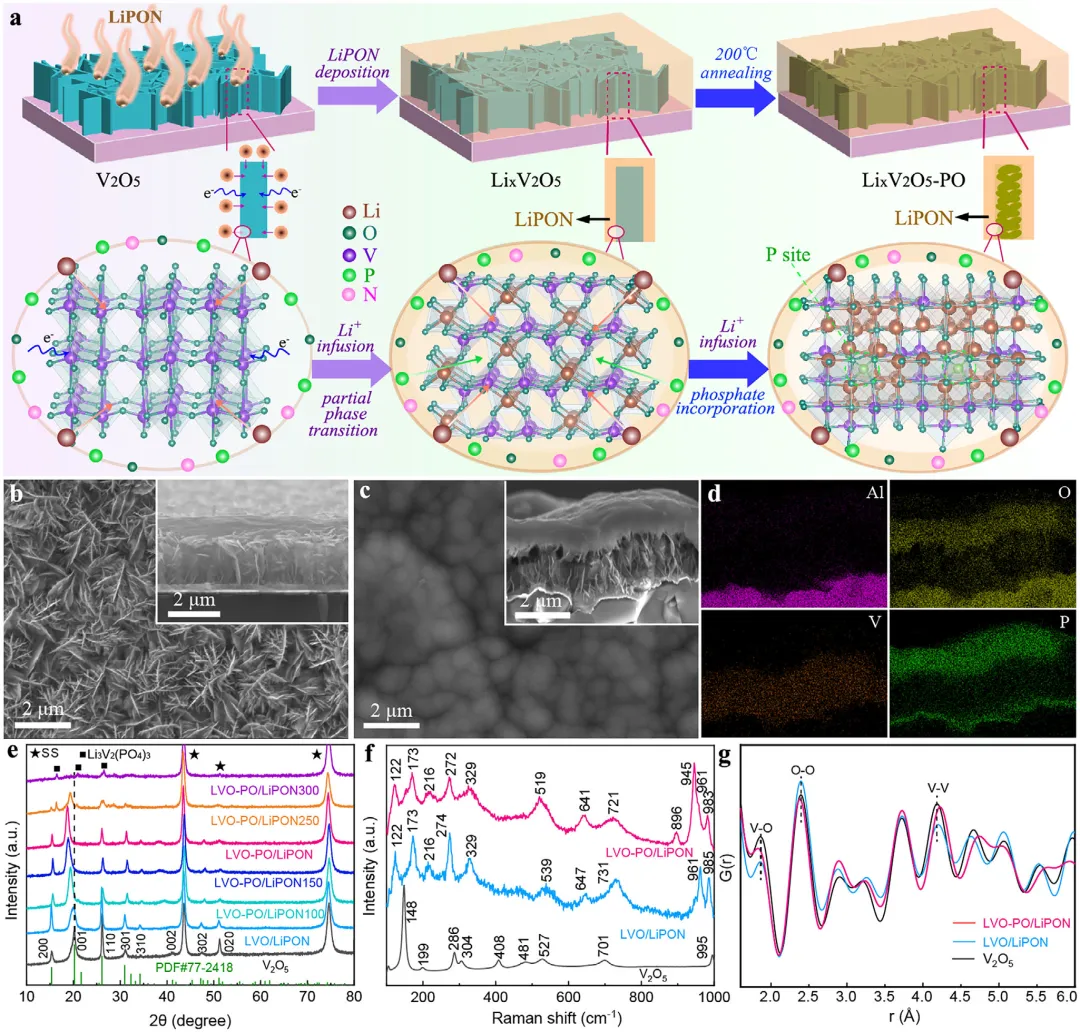 全固态薄膜锂电池(TFBs)是下一代微电子和物联网的理想电源。然而,其发展受到传统正极材料的制约。这些材料通常需要高处理温度(≥500°C)且比容量有限,阻碍了片上集成。本文展示了一种磷酸盐掺杂的阳离子无序岩盐LiₓV₂O₅(LVO-PO)纳米片阵列作为高性能正极。该材料在200°C的低温下处理,并实现了稳定的三锂离子存储。这种独特的结构是通过V₂O₅纳米片阵列与LiPON电解质之间的原位界面反应,再经电化学活化制成,使得LiPON嵌入到LVO-PO区域中。这种架构建立了一个3D离子扩散网络和紧密的电极/电解质界面,促进了锂离子的快速传输。磷酸盐掺杂通过形成一个坚固的框架来增强结构稳定性,以抵御反复的锂离子脱嵌,并降低了锂离子扩散能垒。因此,LVO-PO/LiPON/Li全固态薄膜锂电池在0.2C下提供了高达416 mAh g⁻¹的比容量,良好的倍率性能(2C下为147 mAh g⁻¹)和稳定的循环性能(220次循环后容量保持率为67.9%),其性能优于未掺杂的对照样品以及先前报道的基于V₂O₅的正极。这项工作为高容量、低温可加工的薄膜电极提供了一种新颖的设计策略,推进了片上集成储能的发展。深入剖析 :本研究核心在于通过一种巧妙的低温(200°C)工艺,将原本需要高温结晶的传统正极材料制备过程与固态电解质(LiPON)的沉积相结合,一步实现了材料的“掺杂”、“预锂化”和“3D复合结构构筑”。所得到的LVO-PO材料不仅继承了V₂O₅高理论容量的潜力,更通过磷酸根(PO₄³⁻)掺杂有效稳定了阳离子无序岩盐结构,使其能够在更宽的电压窗口(1.5-4.0 V)内可逆地存储近3个Li⁺。同时,LiPON电解质原位嵌入形成的3D离子传导网络,极大提升了界面离子传输效率。这种材料与器件设计思路,为解决微型化电子设备中高性能、可直接集成(on-chip)的固态薄膜电池提供了极具前景的解决方案。微电子、便携式设备和物联网(IoT)的快速发展,对微型化、安全且高度集成的储能系统产生了迫切需求。全固态薄膜锂电池(TFBs)已成为满足这些要求的关键技术,与传统液态电解质锂电池相比具有显著优势,包括固态架构带来的更高安全性、长循环寿命、薄膜制造工艺、小尺寸以及可直接集成到微芯片、柔性基底和微型传感器中的潜力。然而,TFBs的广泛应用和性能上限目前受到传统正极材料固有局限性的制约。常用的含锂正极,如钴酸锂(LiCoO₂)和锰酸锂(LiMn₂O₄),通常需要高温退火工艺(≥500°C)以实现晶体结构稳定和最佳电化学性能。如此高的热预算与现代微电子器件中常见的温度敏感组件(如硅晶体管、聚合物)从根本上不兼容,从而阻碍了片上集成。此外,这些材料的比容量相对较低(例如,LiCoO₂ ≤150 mAh g⁻¹),限制了具有有限占位面积的TFBs的面容量和整体能量密度。这些挑战推动了对兼具高容量、低温加工性和结构稳定性的新型正极材料的探索。在各种候选材料中,基于五氧化二钒(V₂O₅)的材料因其通过存储三个Li⁺实现的高理论容量(~440 mAh g⁻¹)和低加工温度,作为TFBs的有前景正极受到了相当多的关注。然而,V₂O₅基正极在全固态构型中的实际部署面临关键障碍。首先,V₂O₅本身不含锂离子,这使其在与非锂金属负极(如Si,TiO₂)配对时需要预锂化。更关键的是,尽管有许多关于V₂O₅基TFBs正极的报道,但它们在实际中通常存储少于两个Li⁺,导致其比容量和能量密度无法与LiCoO₂和LiMn₂O₄等传统正极竞争。因此,追求完整的三锂离子存储(通过拓宽工作电压窗口实现)对于提升其容量至关重要。然而,在特定电压(通常约1.5 V)以下实现这种高容量会触发从V₂O₅基正极的层状结构到阳离子无序岩盐LiₓV₂O₅(LVO)相的不可逆相变。这种转变伴随着晶格畸变、层间坍塌和/或V-O键断裂,部分不可逆地破坏了活性材料的结构。此外,这种转变通常会恶化离子迁移路径,导致迟缓的Li⁺扩散动力学、快速的容量衰减和较差的倍率性能。因此,实现高容量需要一个精心平衡的电压窗口,以在保持结构完整性的同时最大化锂离子存储。为解决这些限制,人们已研究了多种用于V₂O₅基正极的方法,包括纳米结构设计、缺陷工程、复合设计和预锂化。然而,V₂O₅基正极的循环性能很少超过50次循环。在V₂O₅基正极中同时实现高比容量和长期循环稳定性仍然是一个巨大的挑战。为克服V₂O₅基正极在高性能片上TFBs中的这些固有限制,本研究开发了一种磷酸盐掺杂的阳离子无序岩盐LVO(LVO-PO)正极。该材料通过层状V₂O₅纳米片阵列与LiPON电解质在低温(200°C)下的原位界面反应,随后进行原位电化学转变而制成。此过程同时实现了钒氧化物框架的锂化和磷酸盐掺杂,并将LiPON并入LVO-PO区域中。在LVO-PO相周围并入的LiPON构建了一个具有改善界面接触的3D离子传导网络,实现了快速的Li⁺传输。此外,磷酸盐掺杂通过形成一个在循环过程中抵抗坍塌的坚固框架,降低了Li⁺扩散的动力学势垒并增强了结构稳定性。因此,与裸LVO正极相比,LVO-PO正极同时实现了循环稳定性和电化学活性的提升。研究人员首先通过室温反应性射频磁控溅射制备了垂直排列的V₂O₅纳米片阵列(图1a, b)。随后沉积LiPON固态电解质,其渗透到纳米片间的空隙中,形成了扩展的3D正极/电解质界面(图S1)。在LiPON沉积过程中,高动能的粒子流促使Li⁺注入V₂O₅结构并还原钒的价态,驱动其向岩盐LVO相转变。后续的低温退火(200°C为最优条件)促进了形成的LVO与LiPON