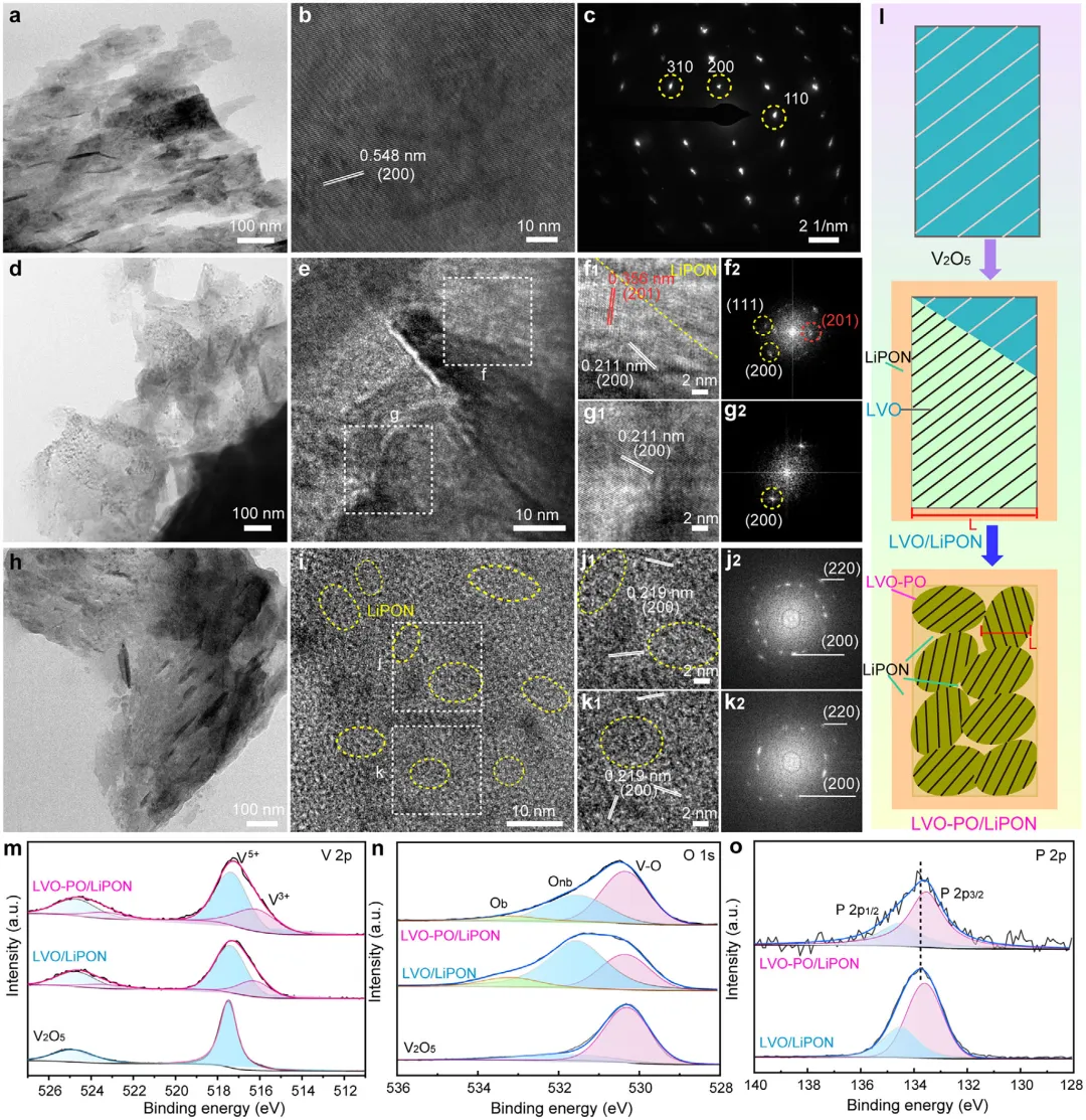 图2、V2O5、LVO/LiPON和LVO-PO/LiPON样品的微观结构表征。