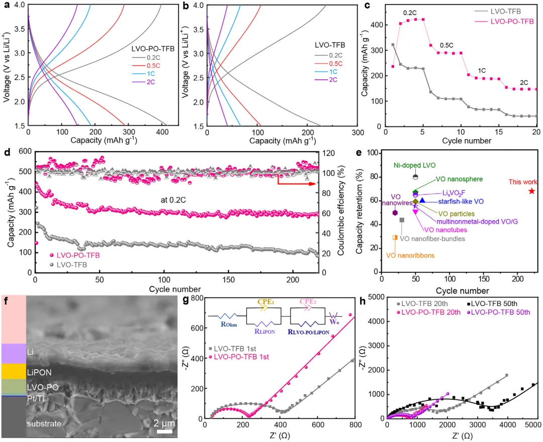 图4、LVO-PO-TFB与LVO-TFB的电化学性能对比及循环后分析。