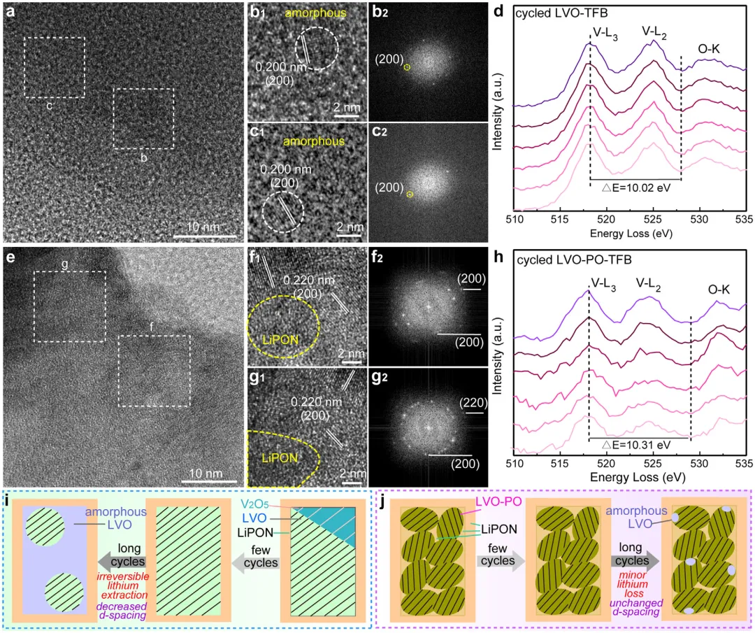图5、循环200次后LVO/LiPON和LVO-PO/LiPON阴极的结构演变。