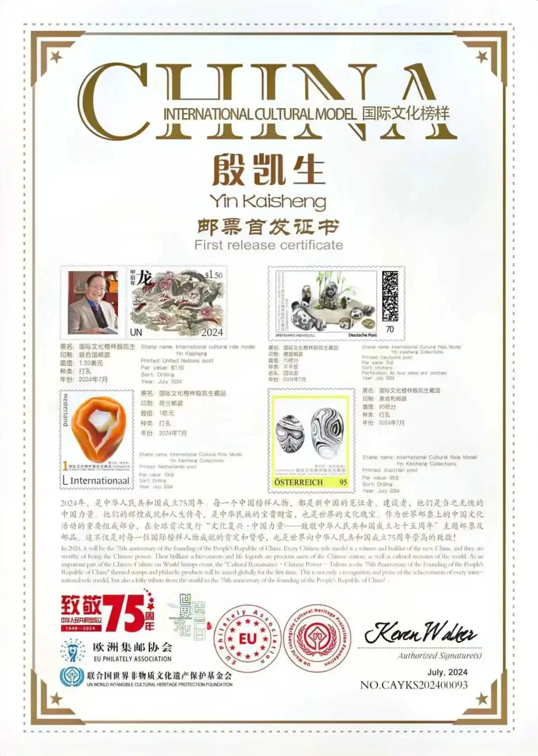 近十余年来,殷凯生老师致力于“石中皇后”雨花石的收藏、鉴赏与研究。首先提出建立“雨花石鉴赏学”的必要性。他的不少藏品在石展中获得金奖。2021年,他成功举办了《美石庆华诞》的大型雨花石精品展,庆祝建党100周年。2014年,他收藏的雨花石精美图片分别登上联合国和德国、荷兰和奥地利发行的邮票上。2025年6月,他收藏的雨花石“中国龙”在中国国家博物馆首次举办的“石韵天成”上展出。