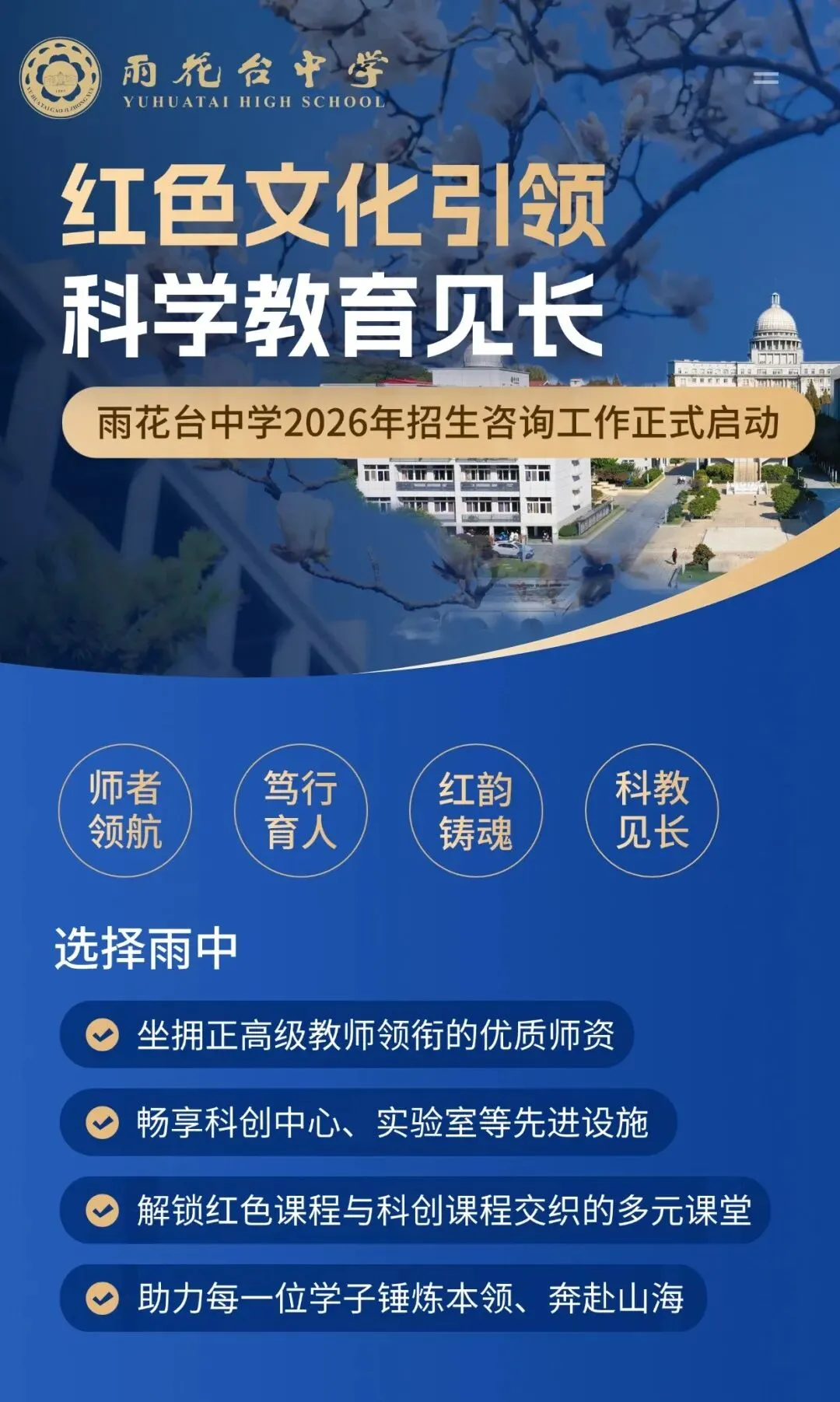 学校以“择高处立、就平地坐、向宽处行”为校训,“红色文化引领、科学教育见长”为办学特色,“传承雨花英烈精神、促进学生和谐发展”为办学理念,致力培养学生“带得走的能力”,清晰的办学思路、鲜明的办学特色和浓郁的文化氛围,让雨中成为南京市中招报考热点学校。