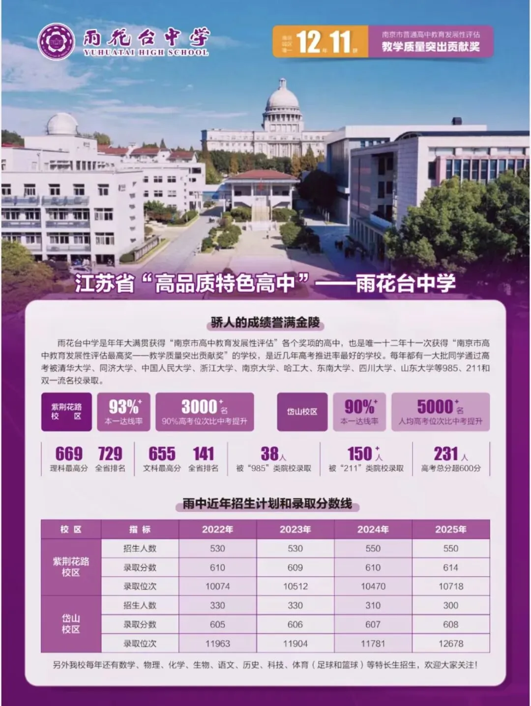 2025年,雨花台中学办学绩效再攀新高,在南京市普通高中发展性评价中蝉联全部七项大奖。其中,“教学质量突出贡献奖”在近十二年中第十一次荣获,成为南京市区唯一获此殊荣的学校。近三年来,学校特控线(一本线)达线率持续保持在90%以上,教学质量稳步提升。