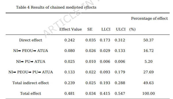 研究证实了“护士创新性→感知易用性→感知有用性→人工智能使用态度”的链式中介路径。即护士的创新性影响其对AI的感知易用性,进而影响感知有用性,最终影响对AI的态度。