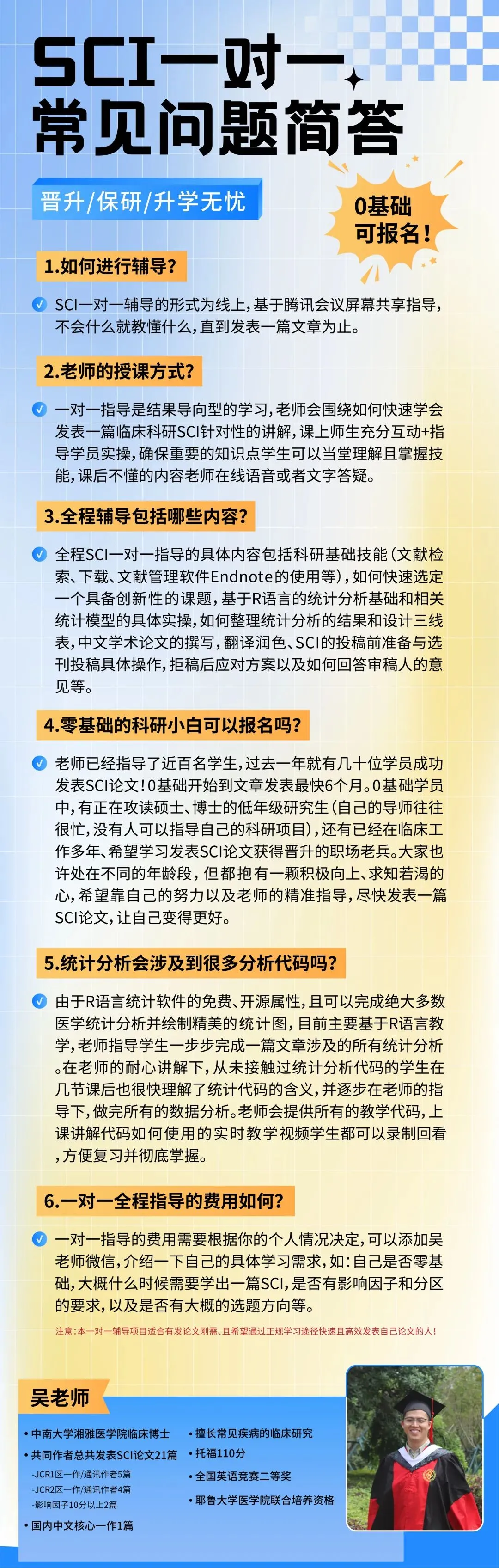 我们定期解读优质文献,分享文章的具体思路和方法学。此外,我们面向护士提供高端一对一科研线上辅导,让零基础的普通人快速学会从0到1发表临床科研SCI论文。