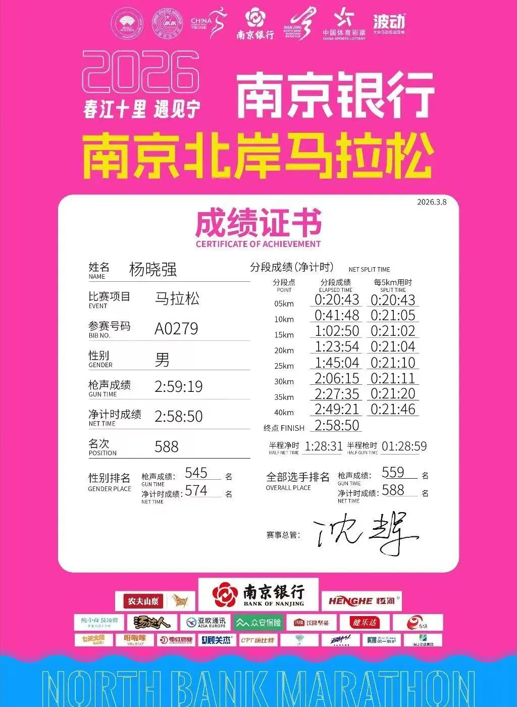 冲过终点线,计时器定格在2小时58分。