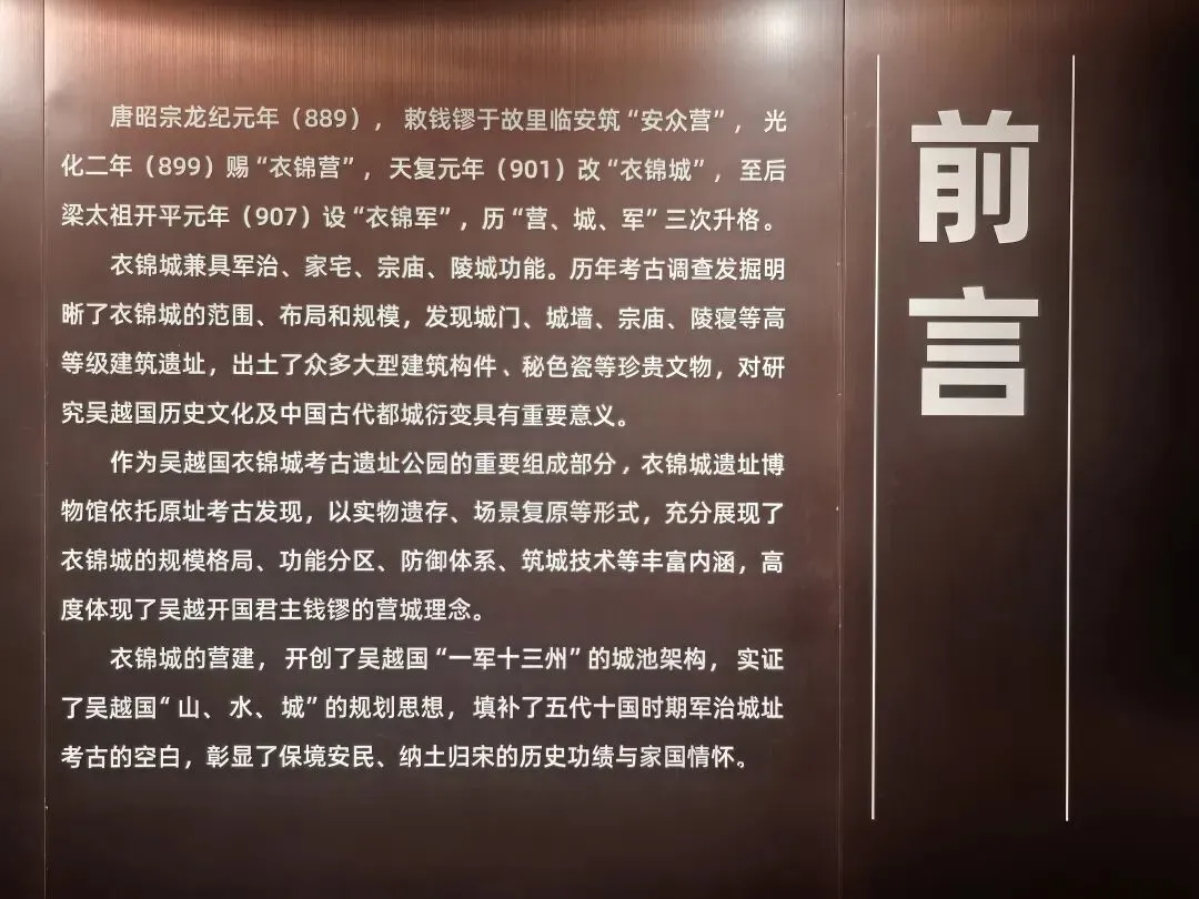 现属吴越国王陵考古遗址公园,设有衣锦城遗址博物馆,原址展示城墙、道路、水井等遗迹,系统呈现吴越国历史。
