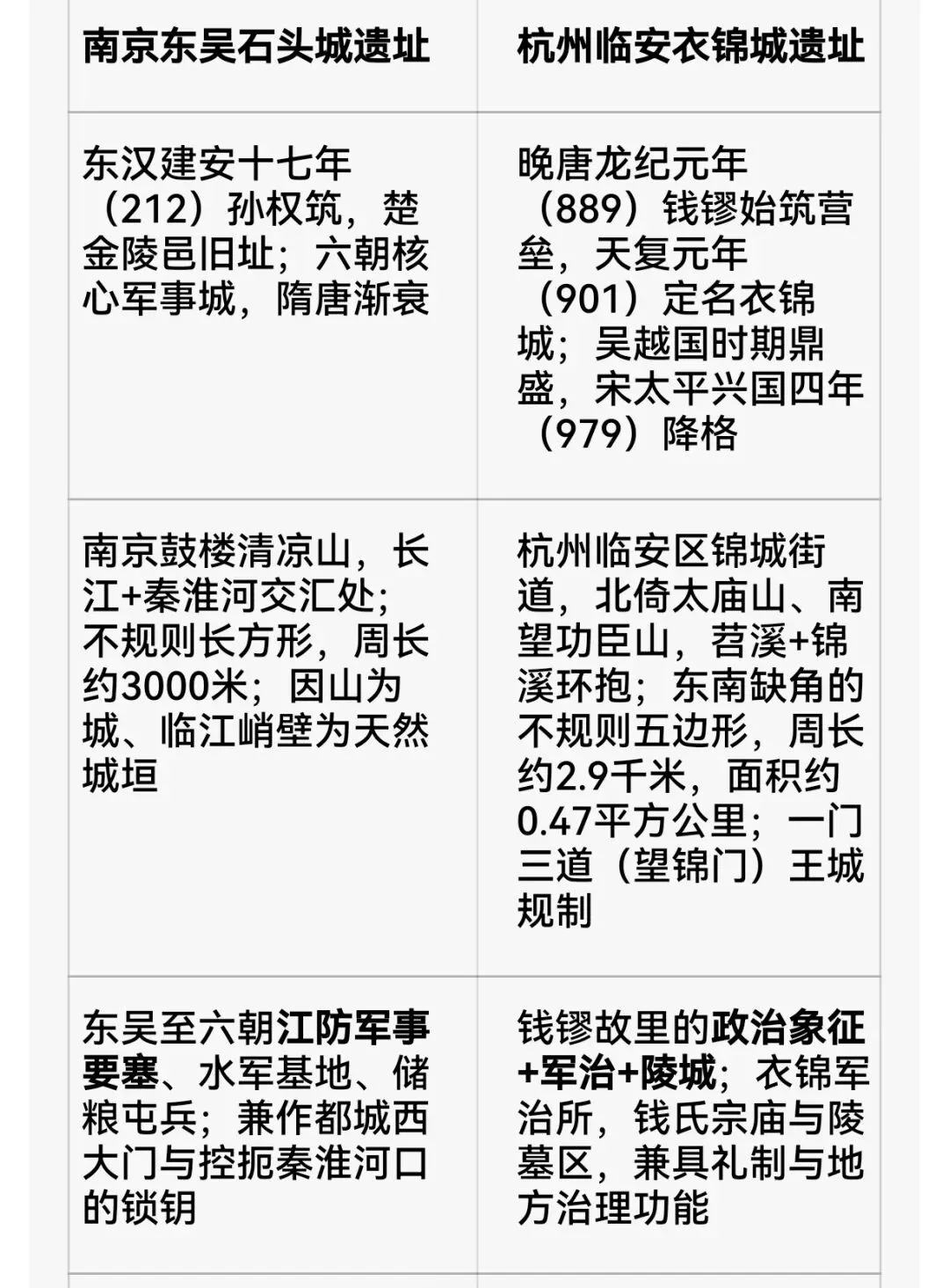 2. 核心差异:石头城以军事江防为第一要务,形制服从于地形与防御;衣锦城以政治礼制+家乡认同为核心,形制体现王城规格,城与陵高度结合;保护方式上,石头城有小的展示馆和露天遗址公园,衣锦城有现代化博物馆的系统展陈。