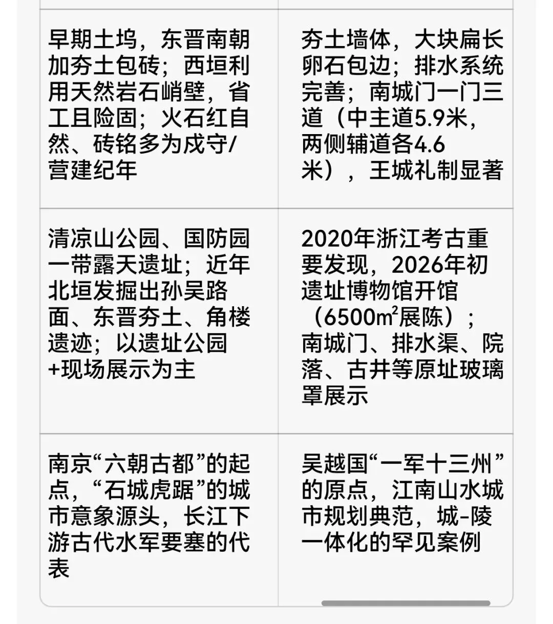 考古与保护现状 清凉山公园、国防园一带露天遗址;近年北垣发掘出孙吴路面、东晋夯土、角楼遗迹;以遗址公园+现场展示为主 2020年浙江考古重要发现,2026年初遗址博物馆开馆(6500㎡展陈);南城门、排水渠、院落、古井等原址玻璃罩展示