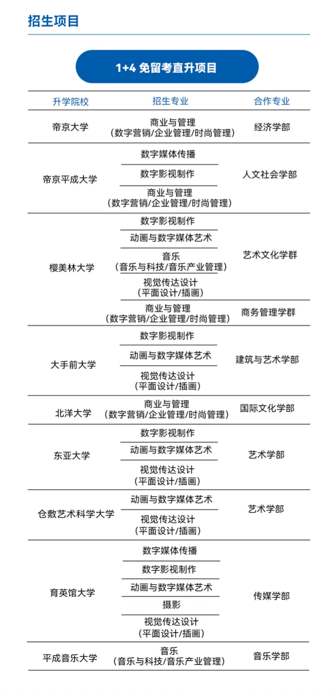 新闻传媒、影视制作、数字媒体技术、时尚管理、表演、舞蹈、动画数媒、服装设计、游戏设计、音乐、视觉传达设计、商业与管理等,满足不同升学规划。