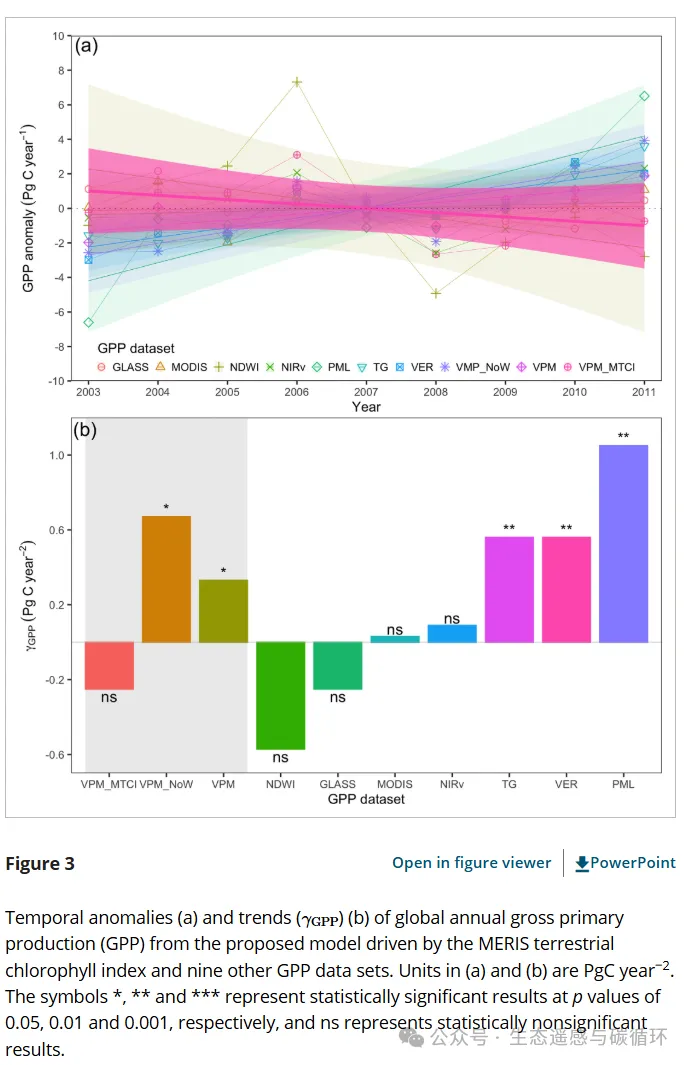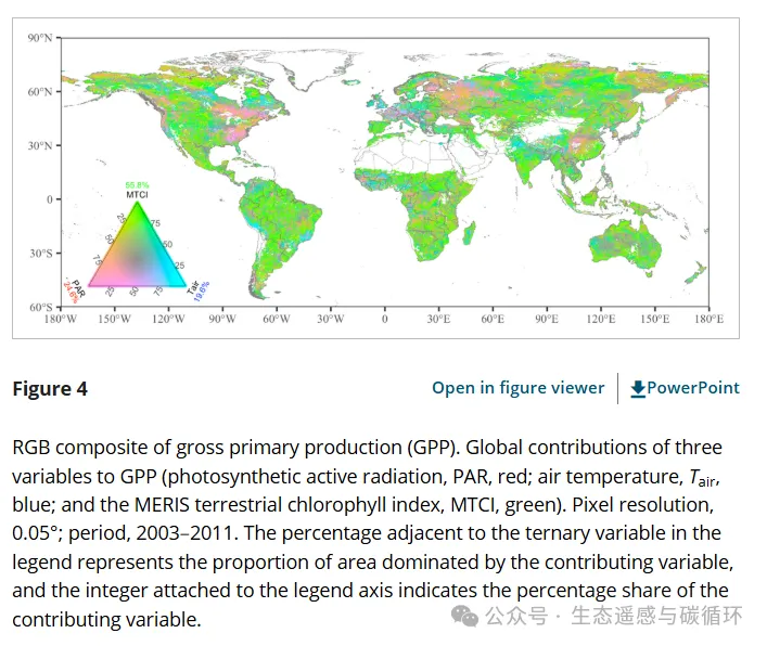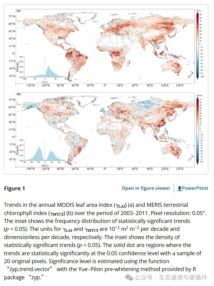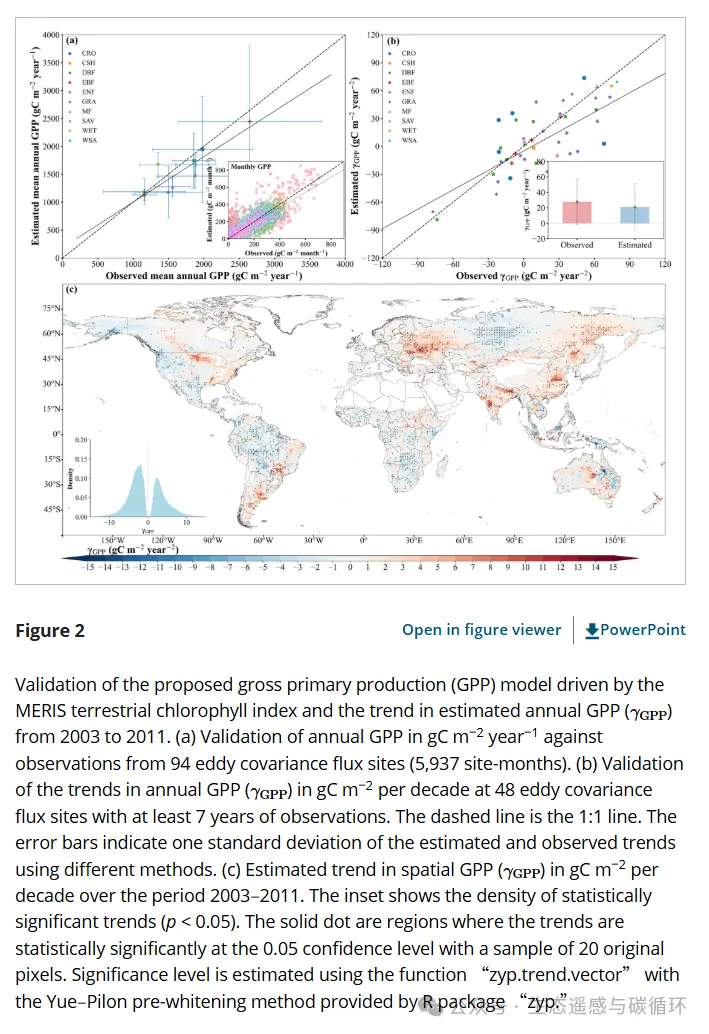 陆地生态系统通过光合作用吸收大气中的二氧化碳并形成总初级生产力(Gross Primary Production,GPP),是全球碳循环的重要组成部分,在调节大气CO₂浓度和缓解气候变化方面发挥着关键作用。然而,由于GPP难以直接观测,目前全球尺度的GPP变化主要依赖遥感反演、生态模型以及地球系统模型等多种方法进行估算。不同研究方法得到的GPP变化趋势存在明显差异,一些研究认为在CO₂施肥效应增强以及人类土地利用管理加强的背景下,全球植被叶面积指数(LAI)显著增加,从而推动了全球陆地生态系统生产力的持续增长;而另一些研究则指出,随着气温升高和蒸汽压亏缺增强,植被水分胁迫加剧,可能抑制光合作用并导致GPP增长减缓甚至下降。这些不一致的研究结论表明,当前对全球陆地生态系统生产力变化机制的认识仍存在较大不确定性。传统的GPP估算模型通常以植被结构指标(如LAI或EVI)作为植被光能吸收能力的重要表征变量,但这些指标主要反映叶面积数量的变化,难以直接反映光合作用过程中关键的生理过程。叶绿素作为植物光合作用中吸收光能并将其转化为化学能的核心色素,是驱动光反应过程和碳固定过程的重要生理基础,其含量变化直接影响植被对光能的利用效率和生态系统的碳吸收能力。然而,由于长期缺乏全球尺度叶绿素观测数据,叶绿素在全球光合作用估算中的作用往往被忽略,使得许多GPP模型无法准确刻画植被光合能力的真实变化。近年来,随着卫星遥感技术的发展,MERIS陆地叶绿素指数(MTCI)为定量监测全球植被冠层叶绿素含量提供了新的数据来源,使得从生理机制角度重新评估全球植被生产力成为可能。因此,有必要在全球尺度上系统分析叶绿素含量变化特征及其对GPP变化的影响,以更准确地理解陆地生态系统碳吸收能力及其变化机制,从而为全球碳循环评估和气候变化预测提供更加可靠的科学依据。该研究从植物光合作用的生理机制出发,将植被叶绿素含量纳入全球总初级生产力估算框架中,突破了传统光能利用效率模型主要依赖植被结构指标(如LAI或EVI)的局限性,从而在模型结构上更直接地刻画了光合作用能量吸收与碳固定过程之间的联系。研究利用MERIS陆地叶绿素指数(MTCI)作为冠层叶绿素含量的遥感代理变量,并将其引入改进的光能利用效率模型中,用以表征植被冠层对光合有效辐射的吸收能力,从而构建了基于叶绿素驱动的全球GPP估算方法。该研究通过对全球叶面积指数与叶绿素指数变化趋势的对比分析,揭示了植被结构变化与生理功能变化之间存在显著不一致现象,即在部分地区叶面积持续增加的同时,单位叶面积的叶绿素含量却呈下降趋势,从而表明传统“地球变绿”并不一定意味着生态系统生产力的同步增强。在此基础上,研究进一步通过多变量回归和贡献度分析评估叶绿素、温度和光合有效辐射对全球GPP变化的相对作用,结果表明叶绿素含量在全球超过一半的植被区域中成为主导GPP变化的重要因子。这一研究从生态系统生理过程角度揭示了叶绿素含量对全球碳吸收能力的重要限制作用,为理解全球植被生产力变化机制提供了新的视角,同时也为改进遥感驱动的碳循环模型提供了重要参考。陆地总初级生产力(GPP)的变化趋势在不同光能利用效率模型之间存在显著差异。目前大多数模型并未将叶绿素含量作为驱动变量,而叶绿素在光合作用过程中对光能吸收具有关键作用。本研究将MERIS陆地叶绿素指数(MTCI)作为叶绿素含量的代理变量,并将其引入光能利用效率模型,以评估叶绿素对全球陆地GPP的影响。结果表明,在2003—2011年期间,全球约11%的植被区域MTCI显著增加,而约15%的区域呈显著下降趋势。进一步分析发现,在全球超过55%的植被区域中,MTCI是影响GPP变化的最重要因素,因此全球GPP整体呈现不显著变化趋势。研究结果表明,陆地植被叶绿素含量对全球GPP具有显著限制作用,但这一关键因素在以往的GPP估算中往往被忽略。本研究强调,在评估陆地生态系统对大气CO₂吸收能力及其潜在驱动机制时,应充分考虑叶绿素含量这一重要生理指标。文章来源:生态遥感与碳循环,版权属于原作者,仅用于学术分享,如涉及内容、版权和其他问题,请联系删除!