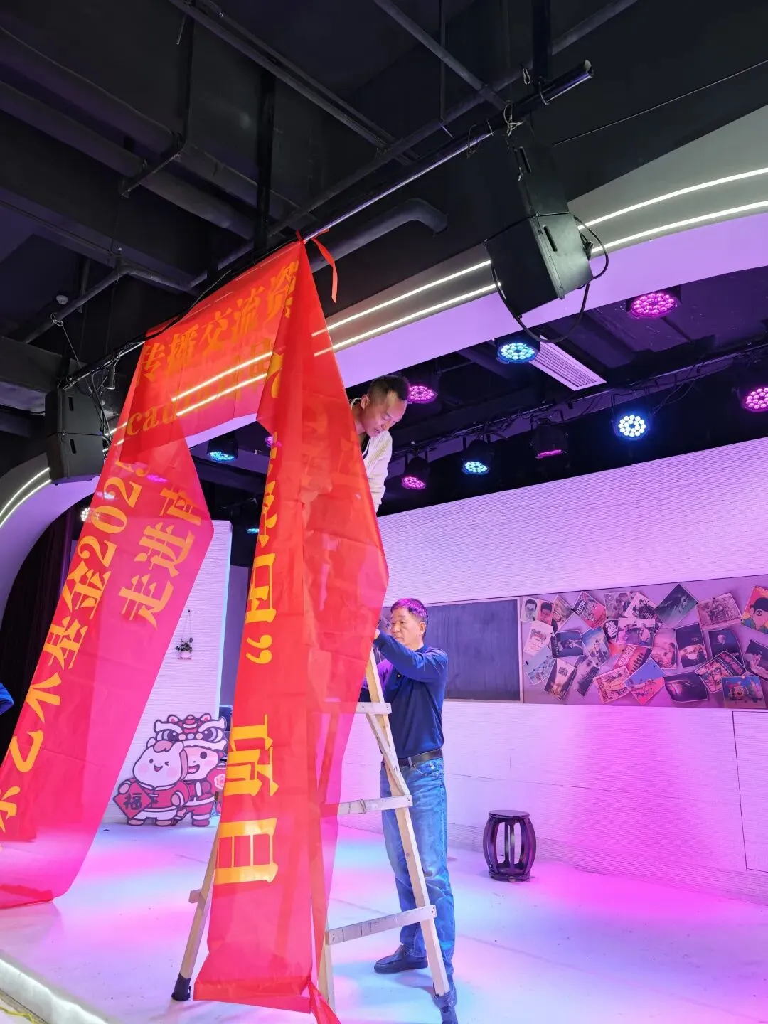 副团长缪伟、袁红的家属更是全家总动员,有的负责音乐播放,有的安装调试字幕机,有的搬运摆放道具,还有的驾着摄像机全程录像,为剧团留下了珍贵的影像资料。