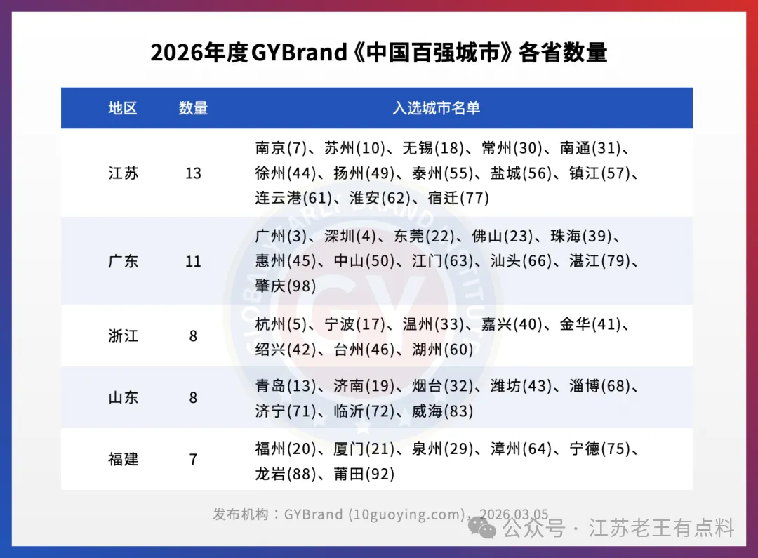 近日,城市指数研究机构GYBrand权威发布了《2026年度中国百强城市指数》,其中南京表现抢眼,位列全国第七,跻身准一线城市行列!更令人瞩目的是,江苏全省13市全部入选百强榜单,(点击图片放大查看)实现了“大满贯”,展现了从“全域覆盖”到“全域提质”的华丽蜕变。这一成就不仅彰显了江苏“强省强市、全域协同”的高质量发展模式,更为全国区域均衡发展树立了典范。该指数从经济实力、基础设施到创新活力等十大维度全面评估,为我们呈现了一幅百强城市高质量发展的生动图景。来源:江苏经济报