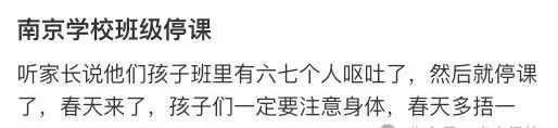 网友表示:听家长说他们孩子班里有六七个人呕吐了,然后就停课了,网友提醒:春天来了,孩子们一定要注意身体,春天多捂一捂,别着急减衣服。