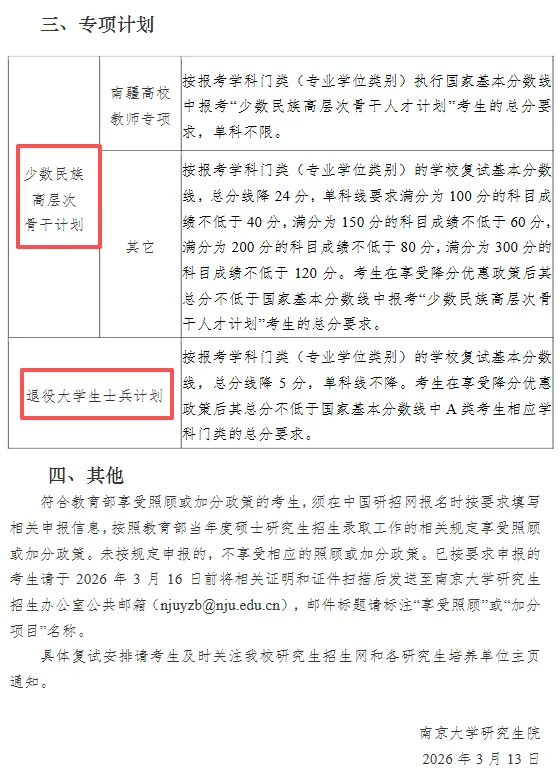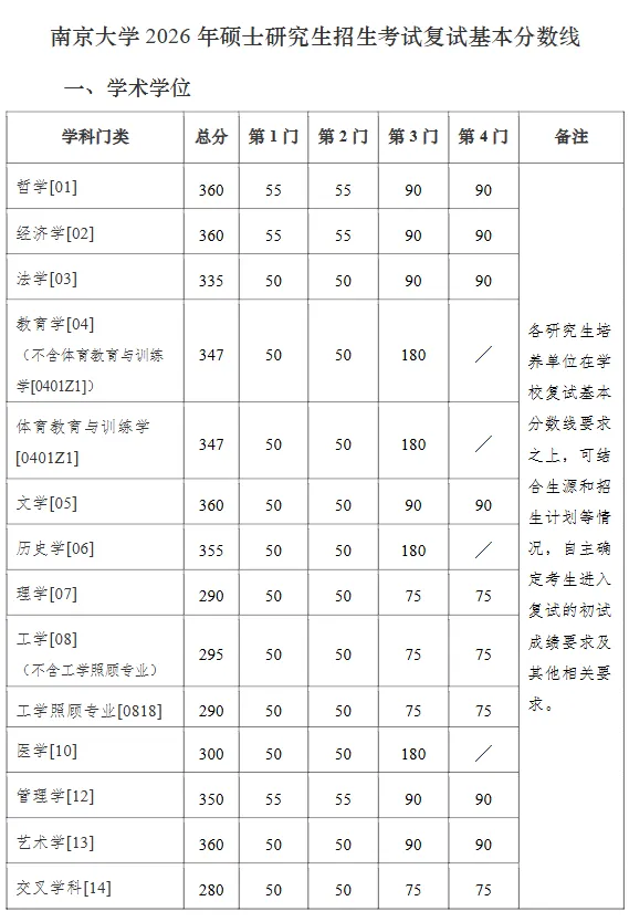 >南京大学2026年硕士研究生复试基本分数线mba146分,mpa190分,mpacc199分,图书情报254分,mem166分,审计 199分.