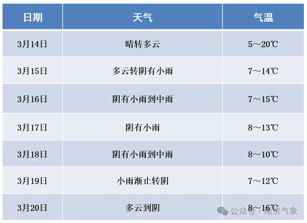 全市今天下午到夜里晴转多云东到东北风4级左右今天最高气温:19℃到20℃明晨最低气温:8℃到9℃3月15日全市多云转阴有小雨东北风4级左右3月15日最高气温:15℃左右3月16日最低气温:8℃到9℃3月16日全市阴有小雨偏东风4到5级3月16日最高气温:11℃到12℃3月17日最低气温: