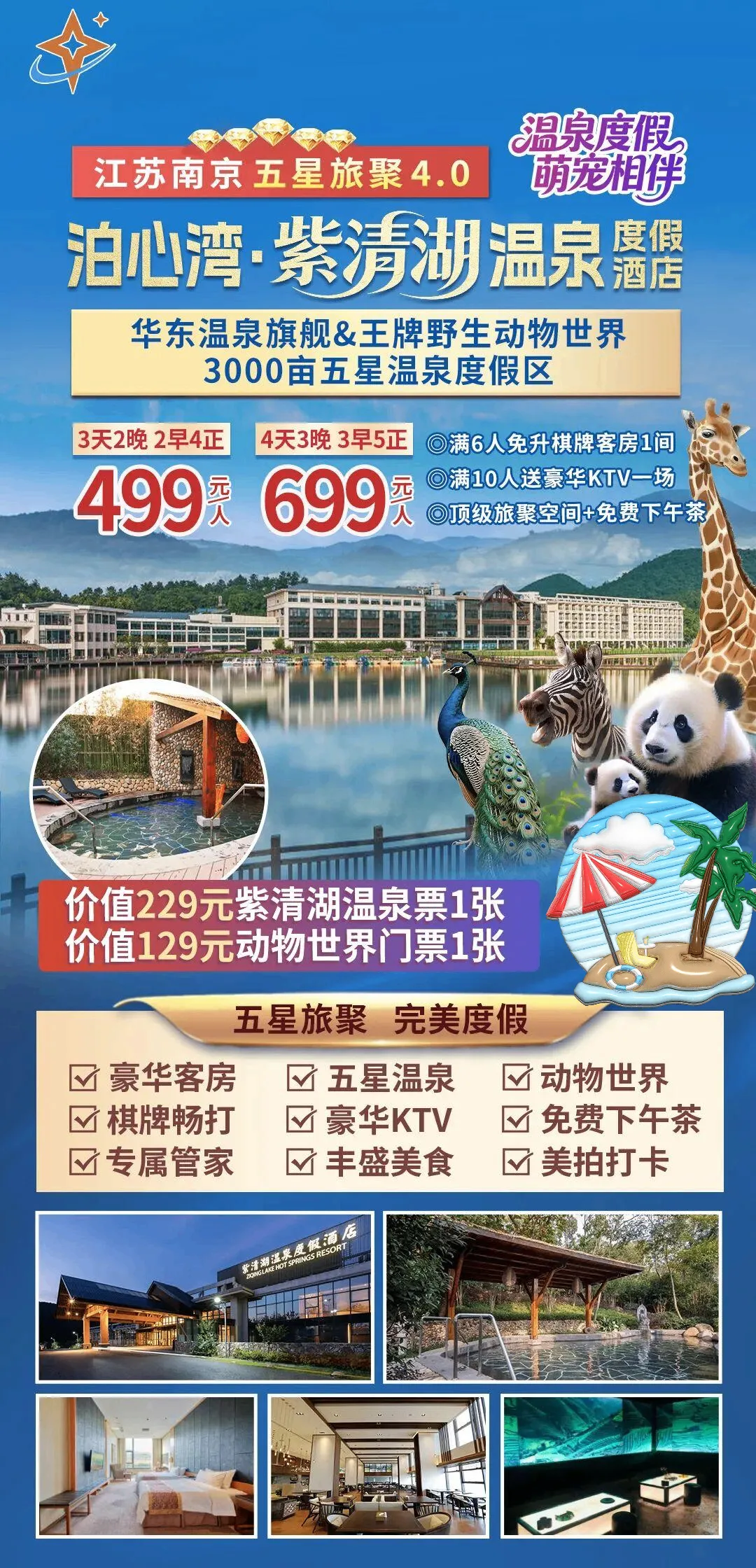 汤山温泉●江苏南京紫清湖温泉度假酒店】3天2晚499元/人起●含2早4正●享棋牌客房畅打●豪华KTV●森林温泉+动物园门票
