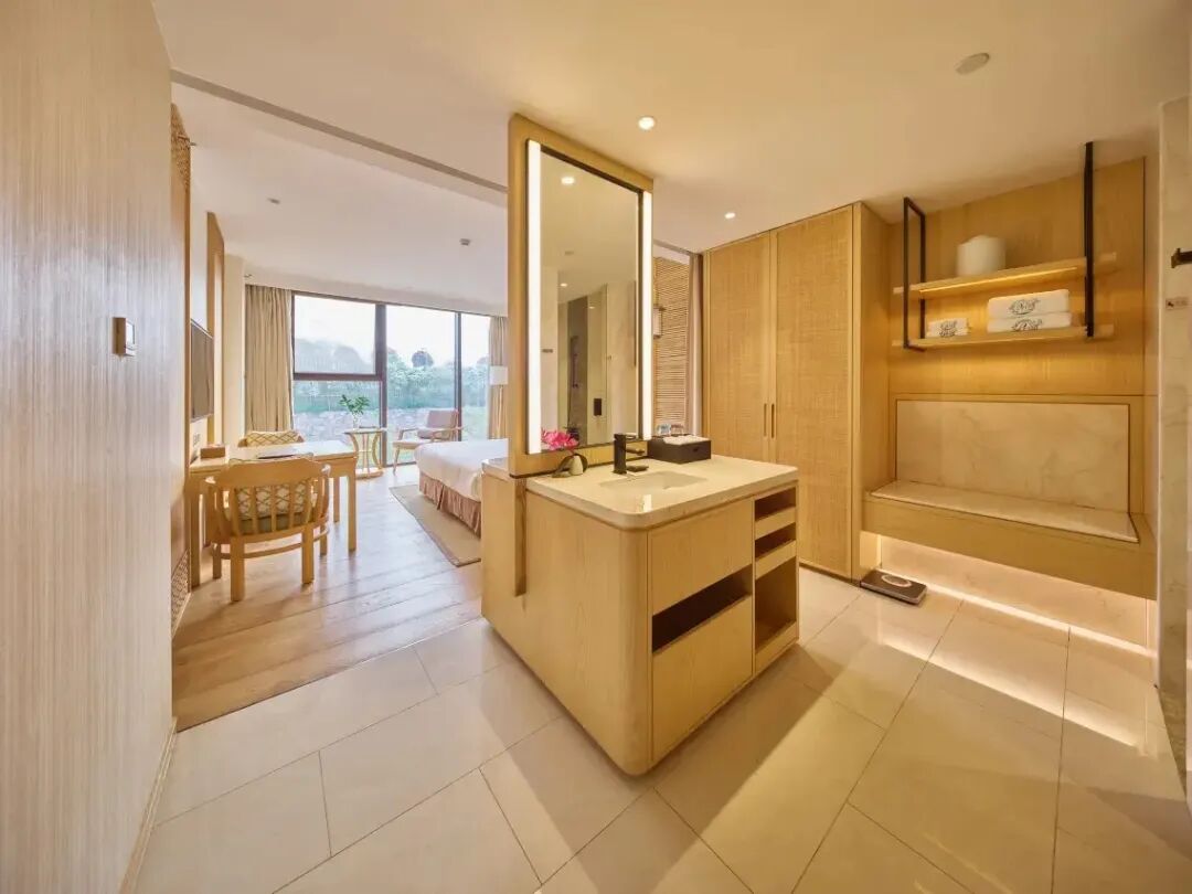 步入12米挑高的大堂,原木材质与天然温泉石摆件营造出温润的氛围,暖黄灯光搭配轻柔的背景音乐,瞬间驱散旅途疲惫。酒店山景高级房将自然美景框进窗内。大量运用的天然材质与温和色调,让每一间房都成为身心灵休憩的容器。每间客房都融入自然元素,面积宽敞明亮,软硬件设施豪华舒适。
