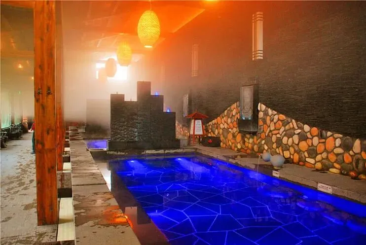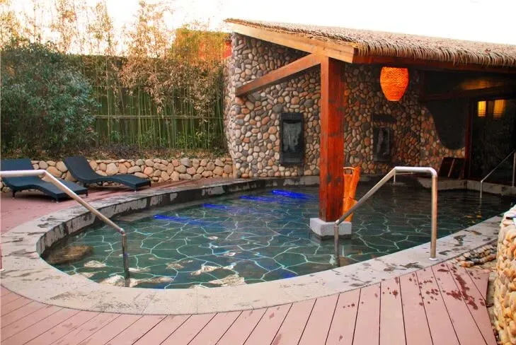 户外森林温泉掩映于郁郁葱葱的林木之中。瀑布池、石板浴、花香浴……三十泓形态各异的泉池星罗棋布。沐浴其中,远处的湖光山色尽收眼底,听鸟语啾啾,感水滑洗凝脂。