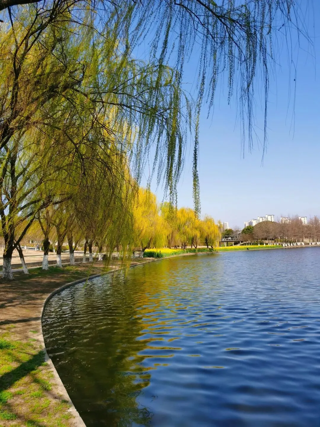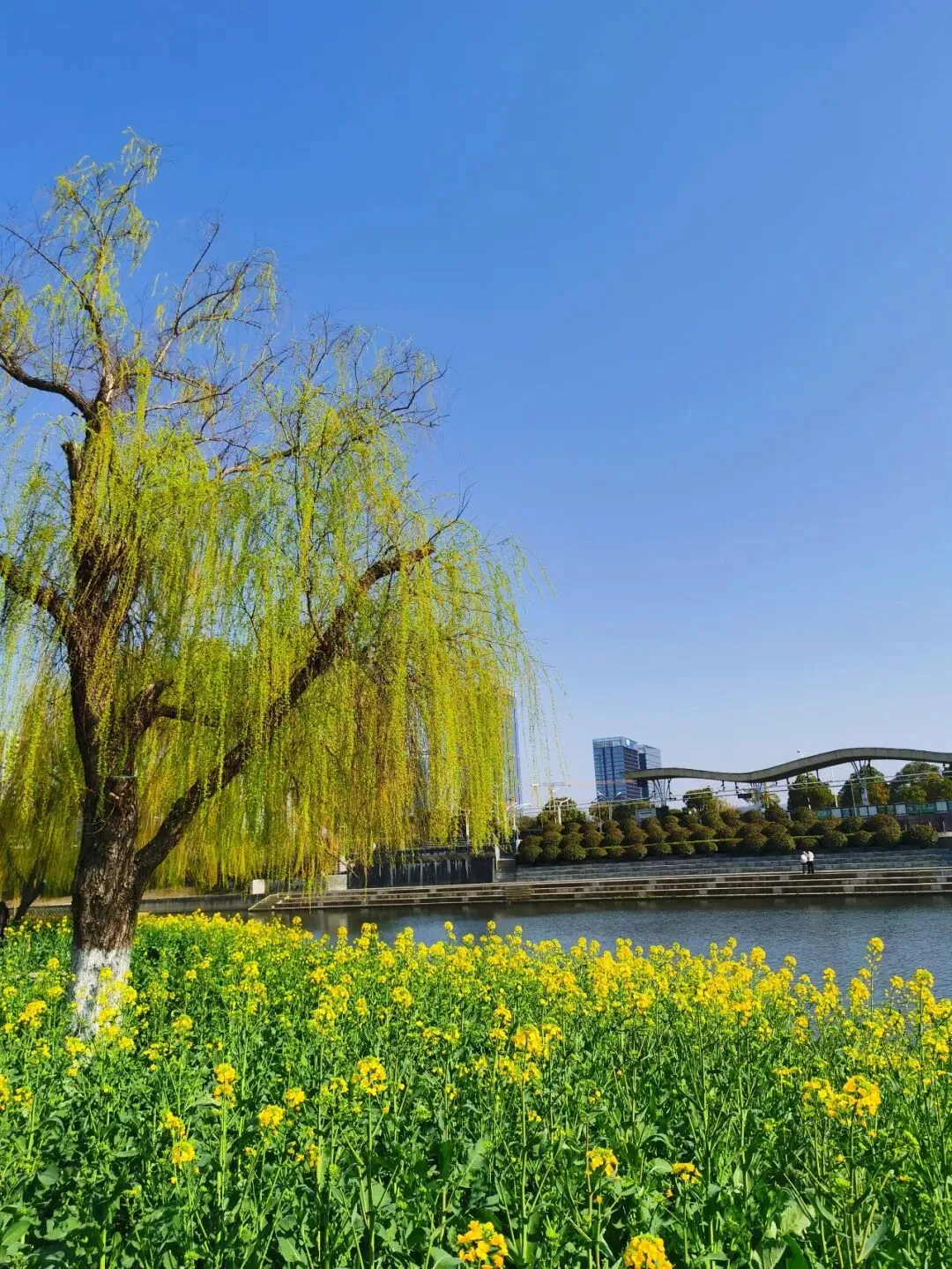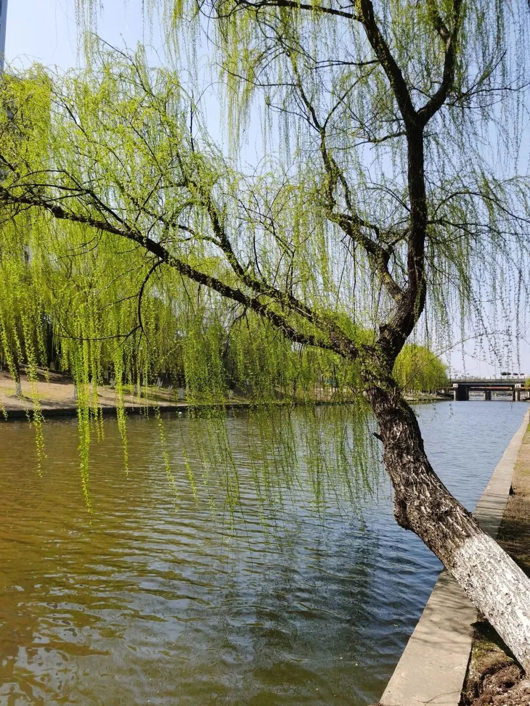 垂柳几乎与河水吻上了。看来,春天的浪漫不只属于花朵。