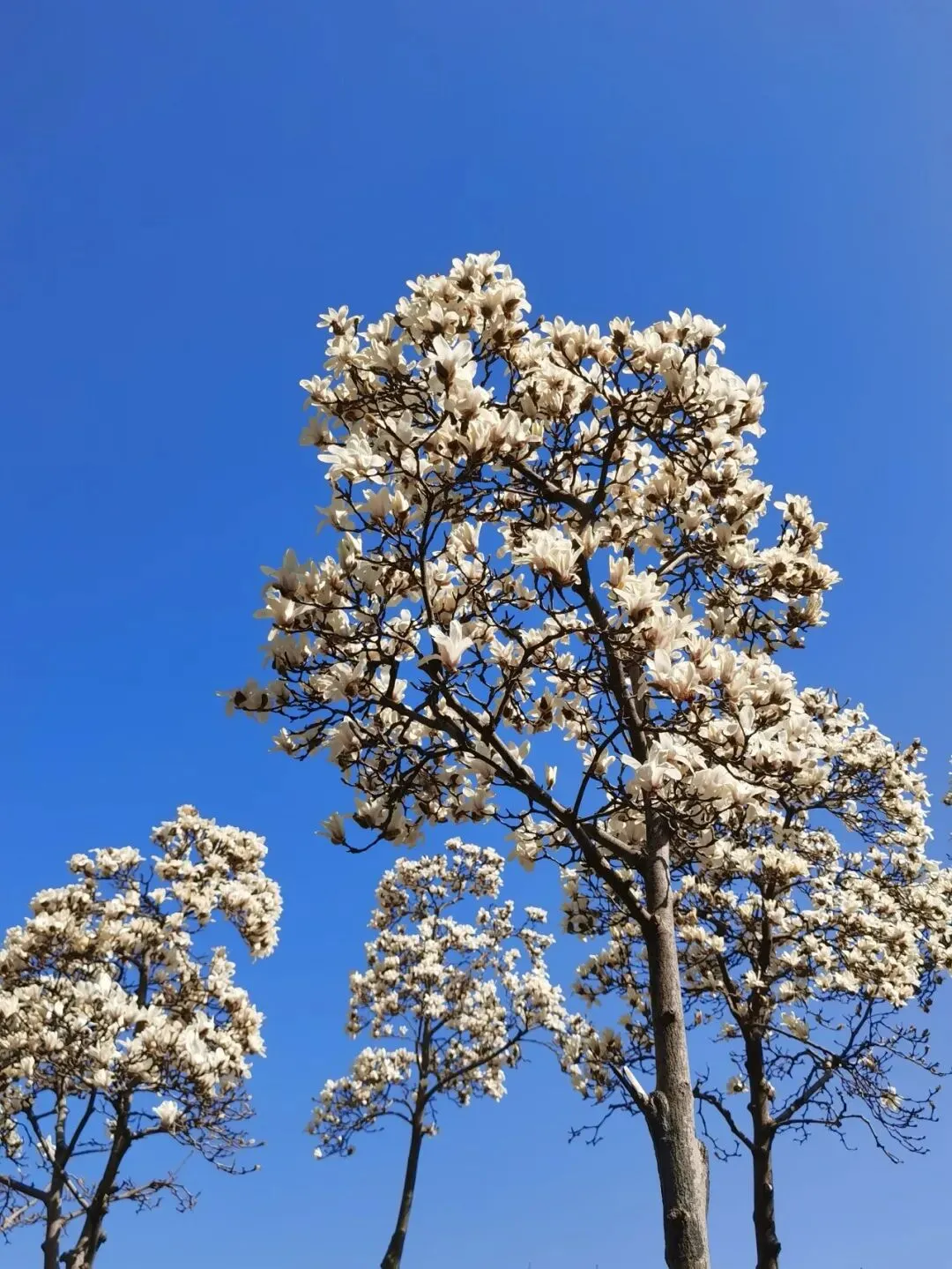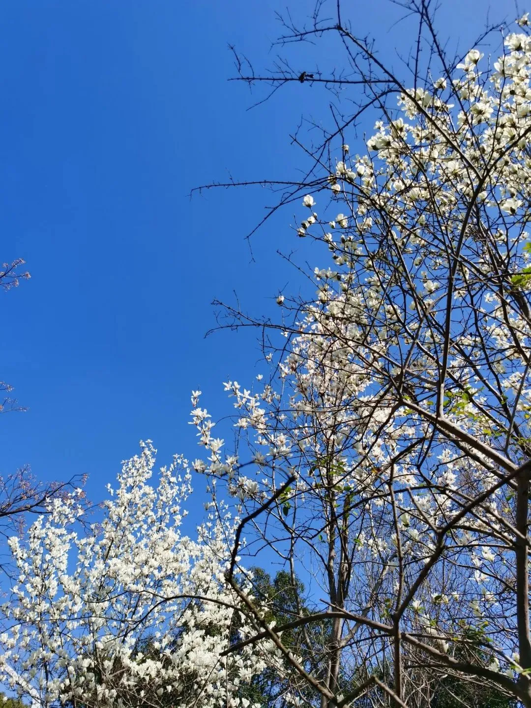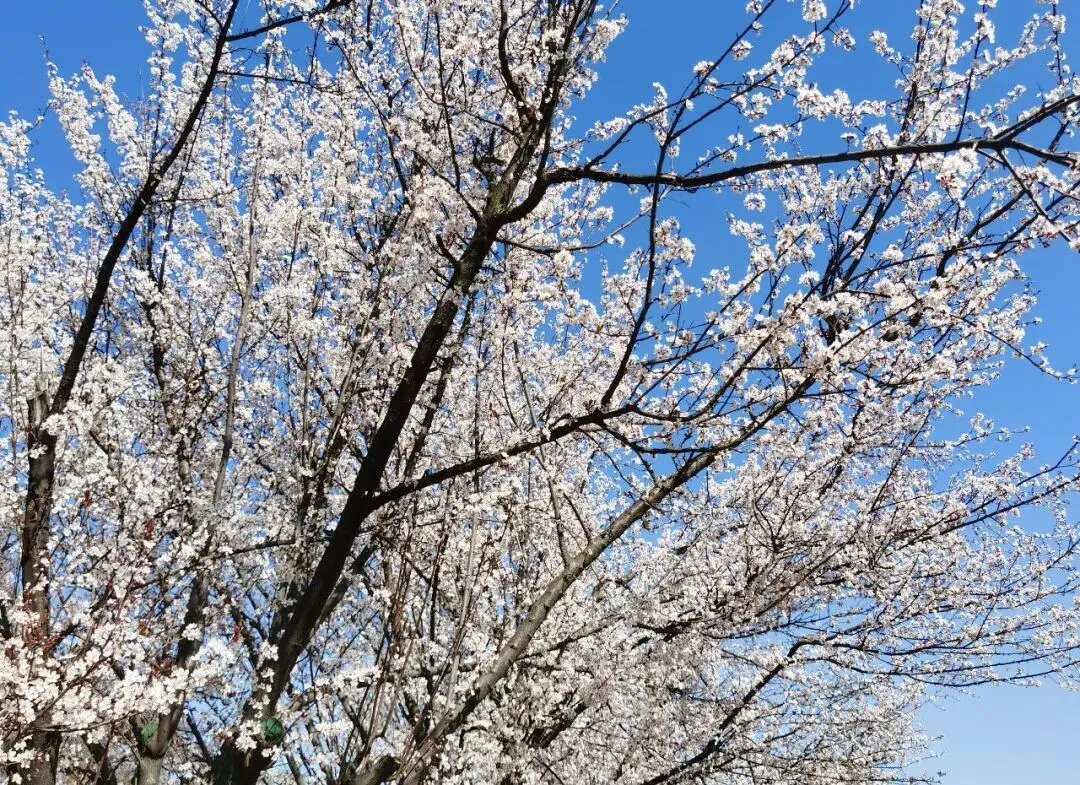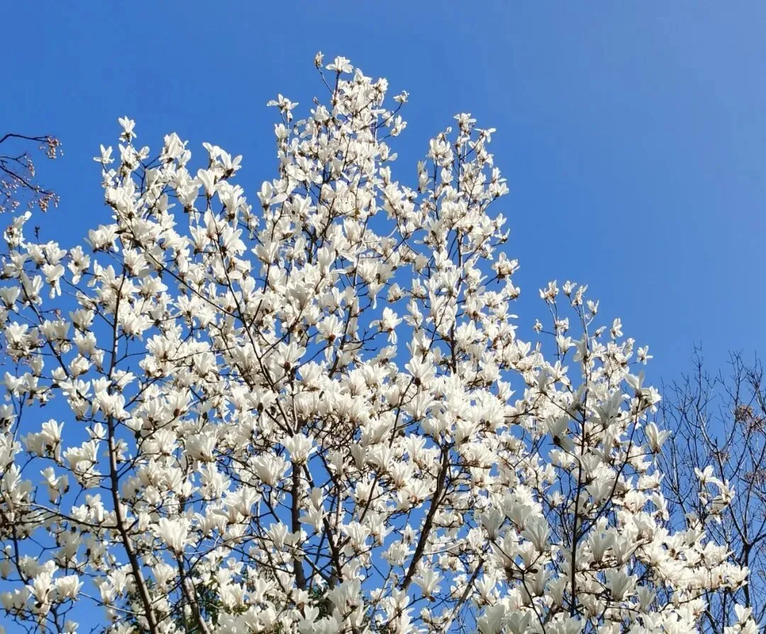 再往前,是一段开阔的河岸。几株高大的玉兰树伫立在那里,与樱花的娇柔截然不同。它们的花是硕大的,端庄的,像一只只白玉雕成的酒杯,直直地朝向湛蓝的天空,盛满了阳光。