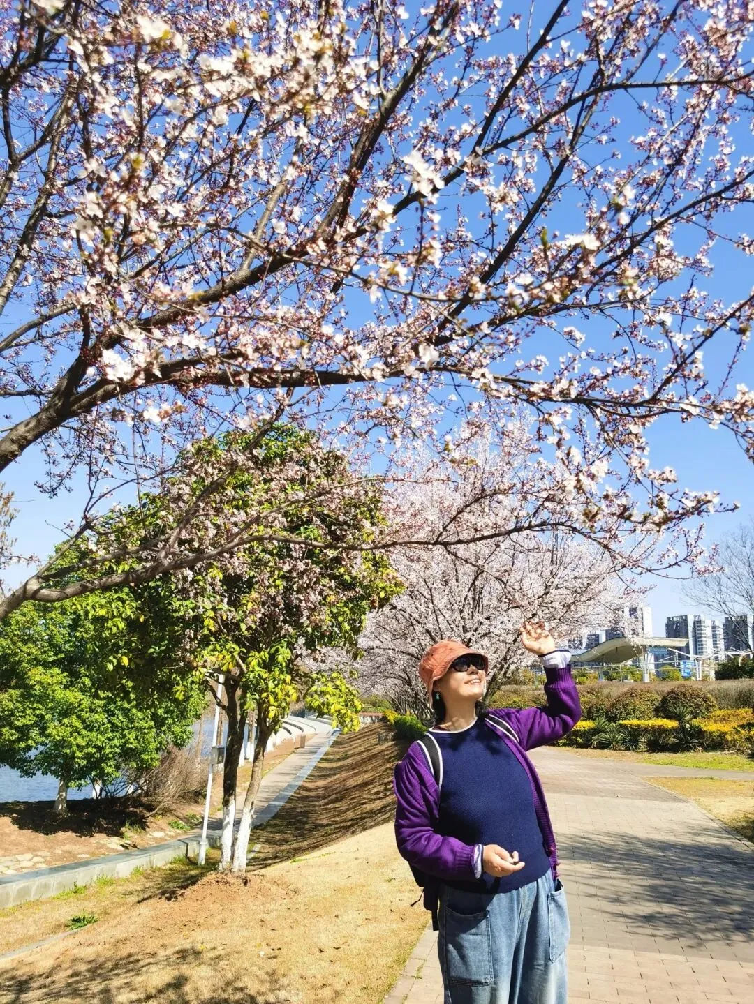 走不过一公里,一片粉色的云霞便扑入眼帘——是河畔的樱花林。