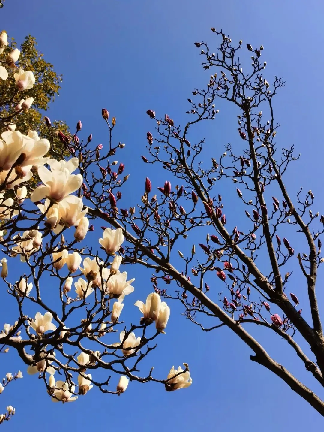 盛开的白玉兰和含苞的紫玉兰,一同被蓝天收藏。