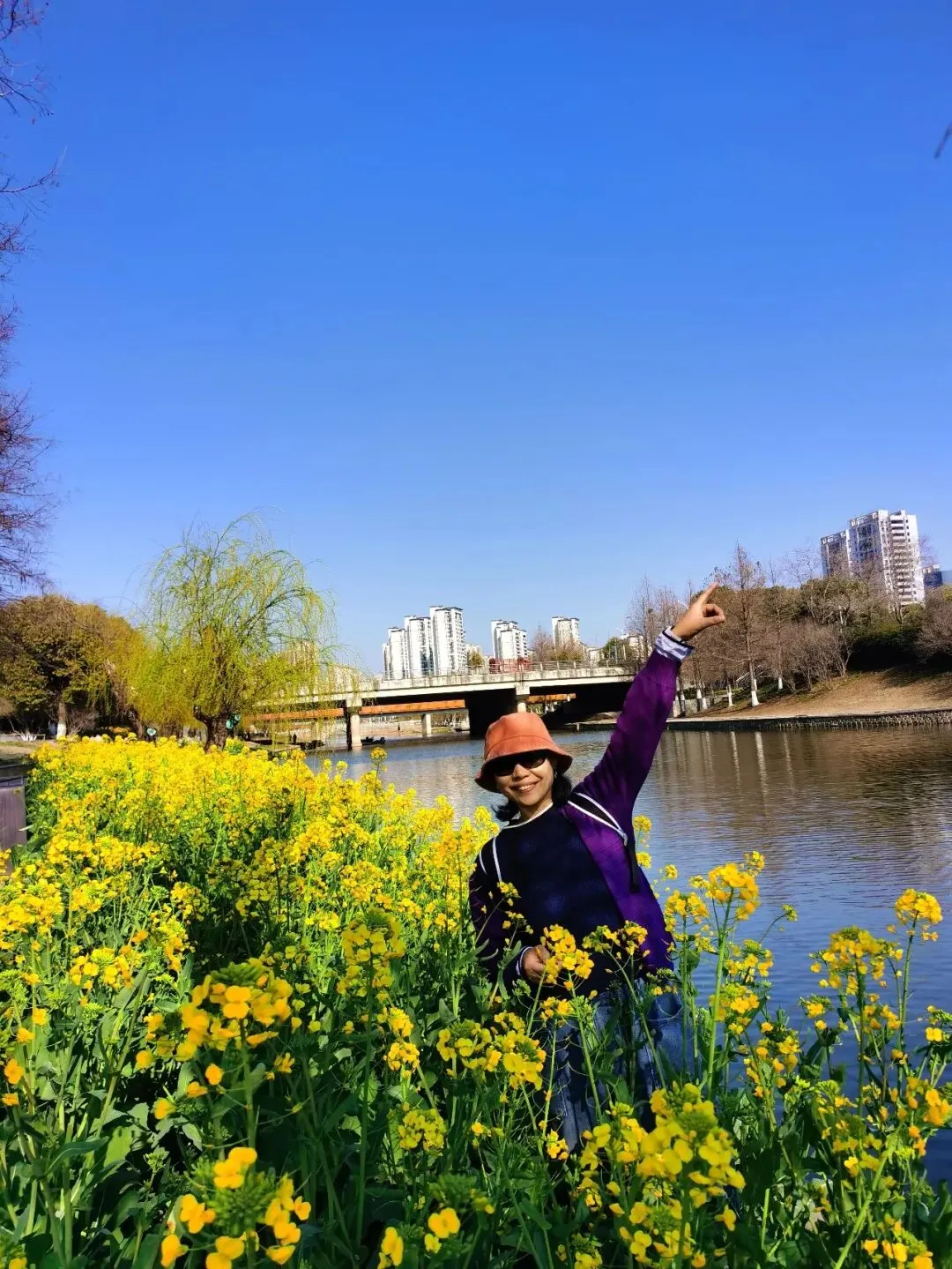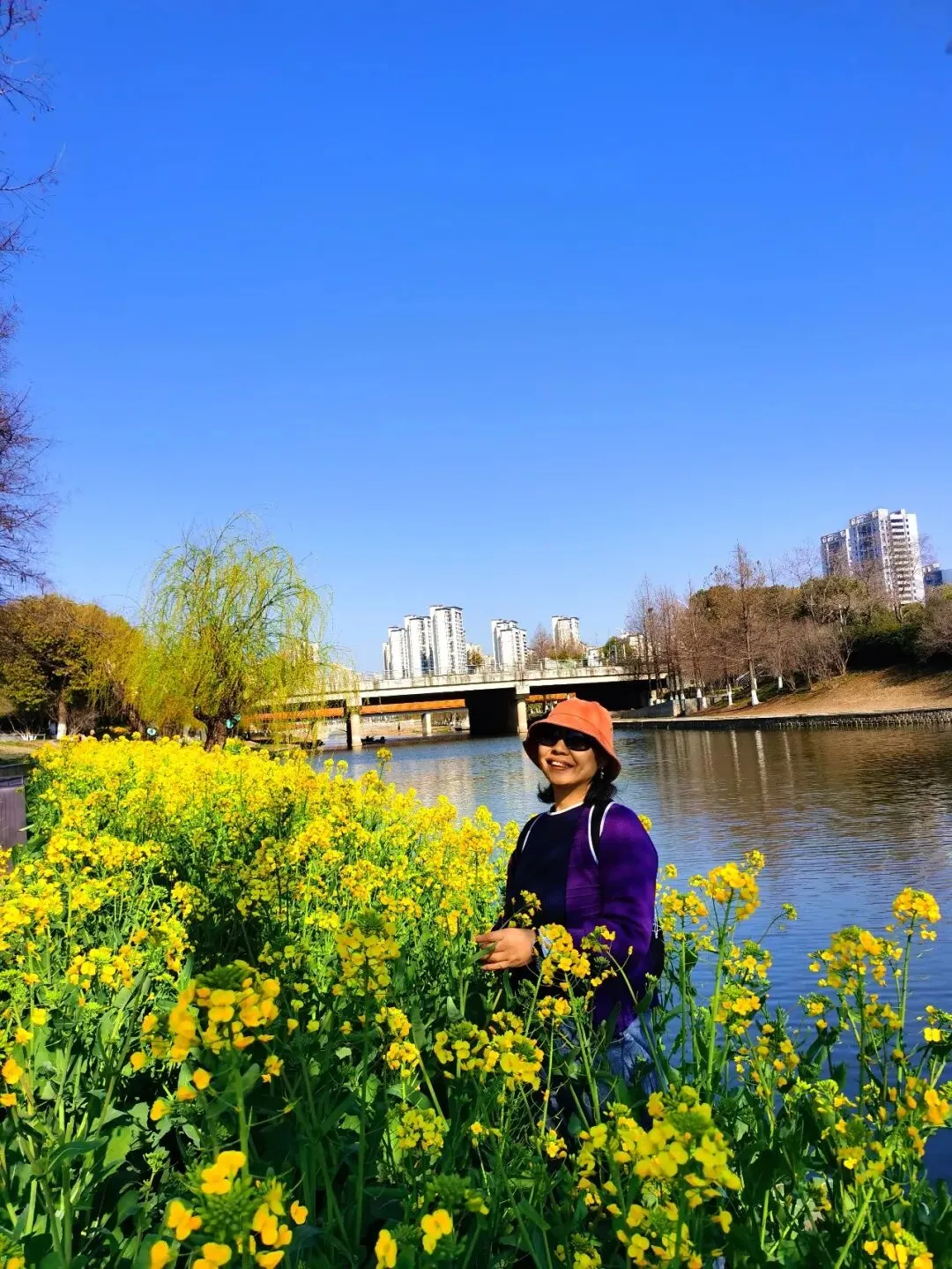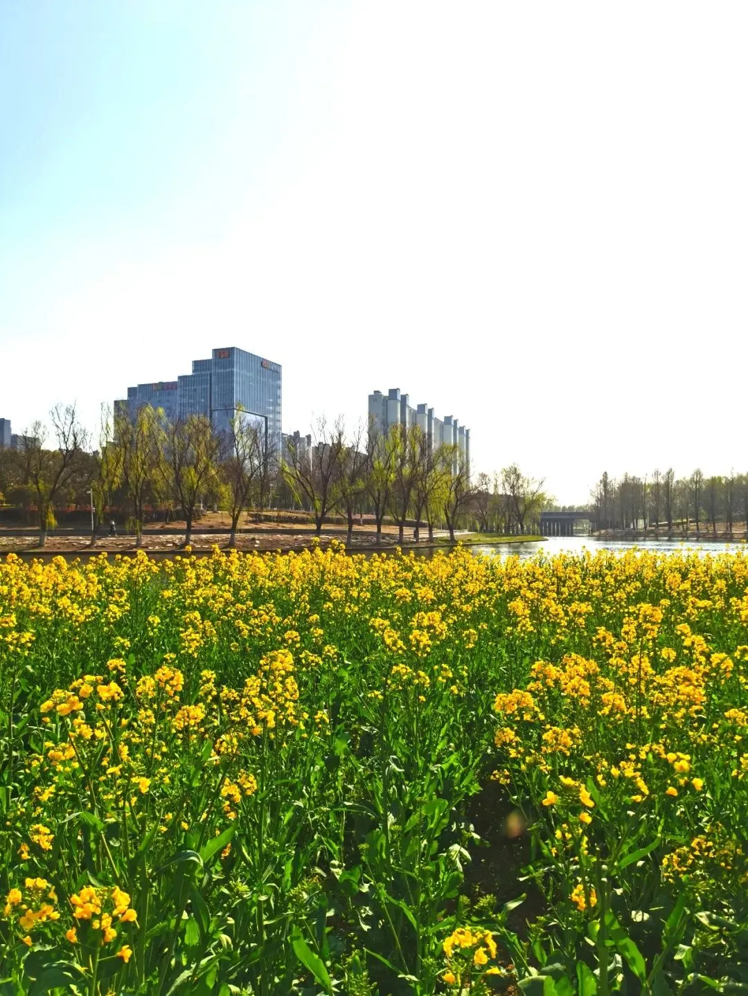 耀眼的、毫无保留的金黄色,从脚下一直蔓延到视线尽头,与蓝天、碧水、石桥、远处的绿树和楼宇,构成了一幅色彩浓烈到近乎喧嚣的油画。