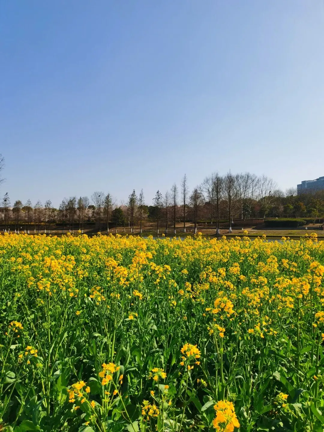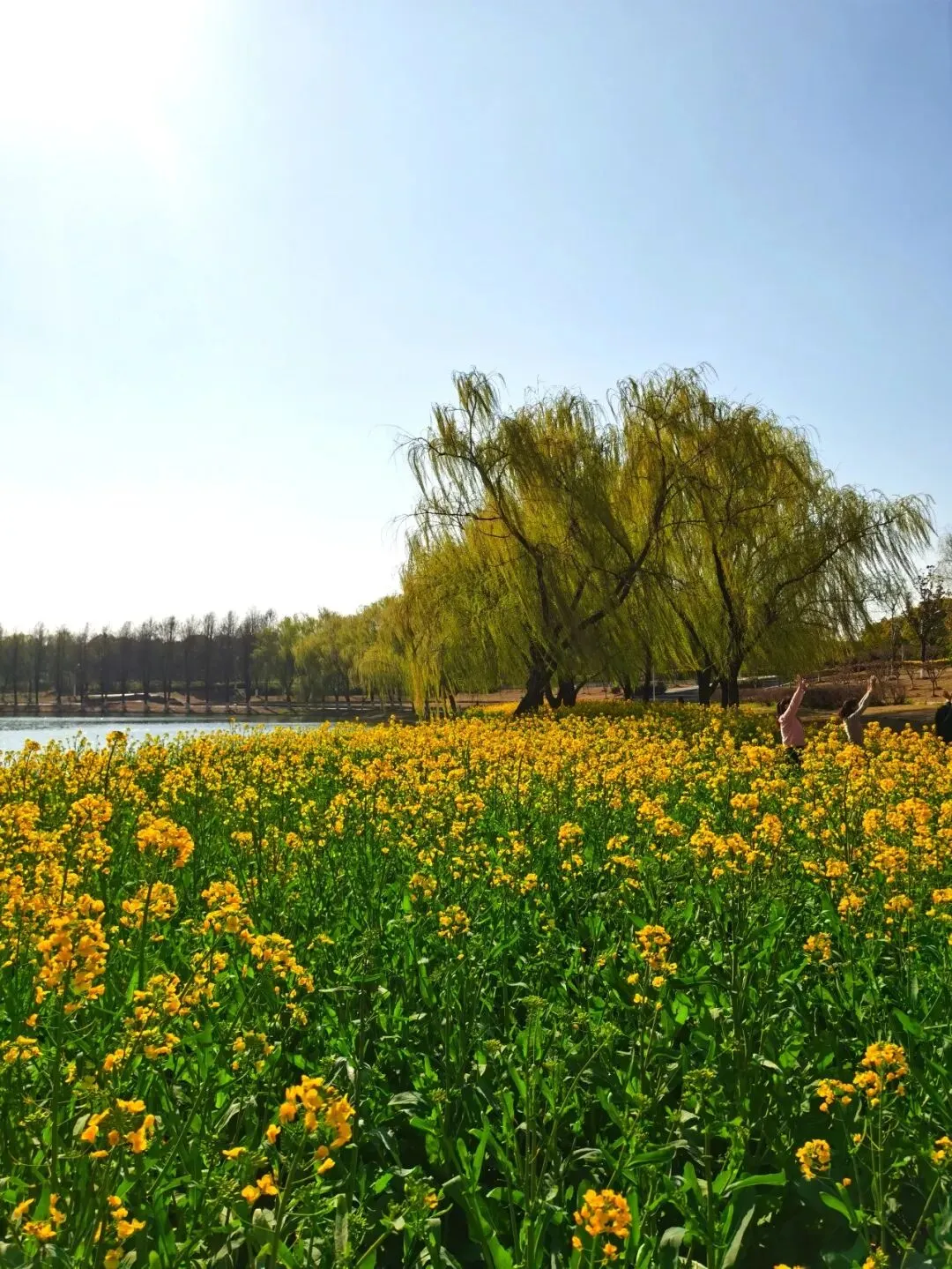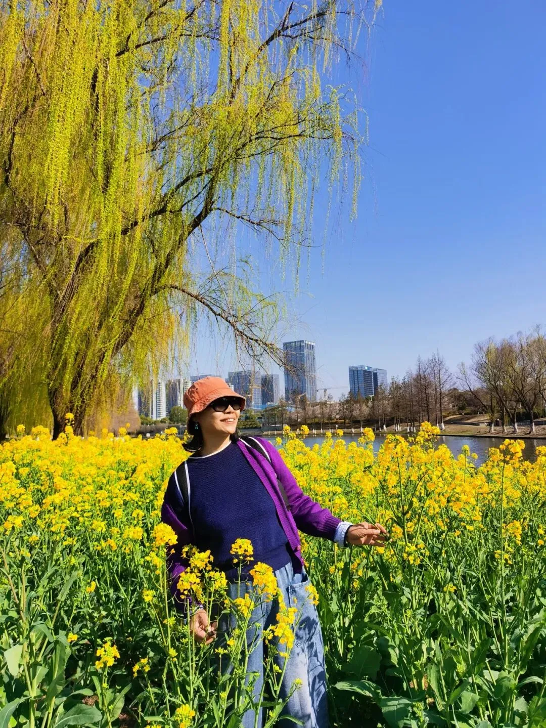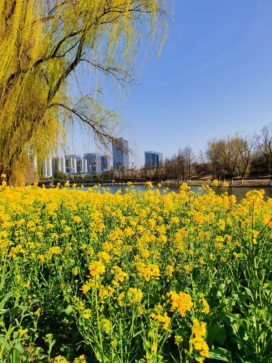 耀眼的、毫无保留的金黄色,从脚下一直蔓延到视线尽头,与蓝天、碧水、石桥、远处的绿树和楼宇,构成了一幅色彩浓烈到近乎喧嚣的油画。