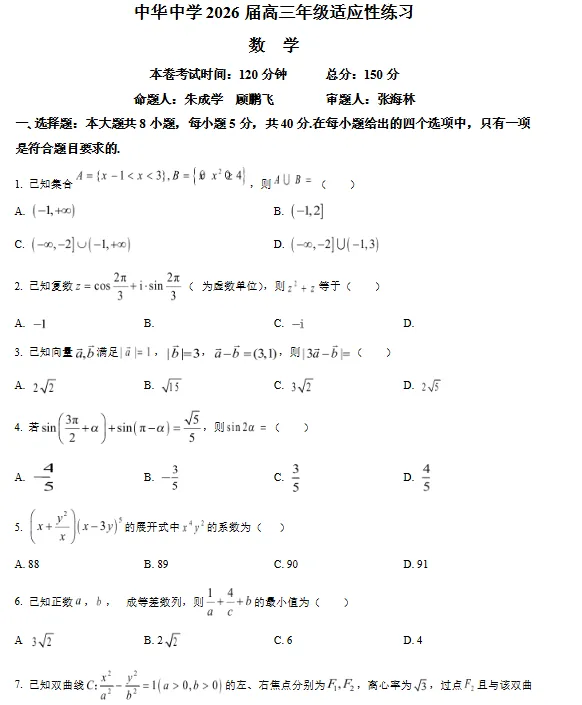 >江苏南京市中华中学2026届高三模拟预测数学试卷及答案