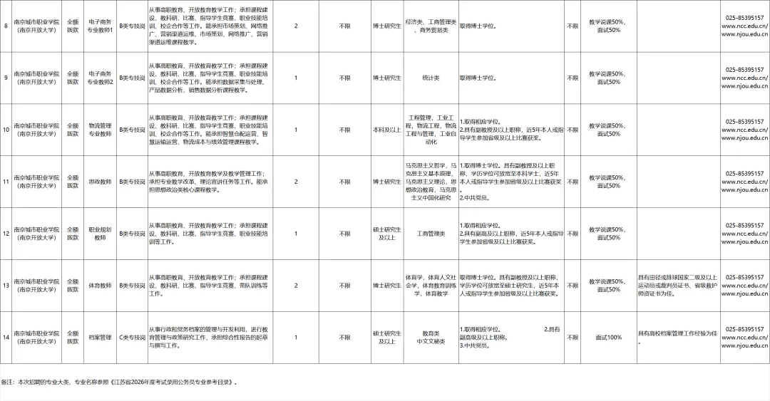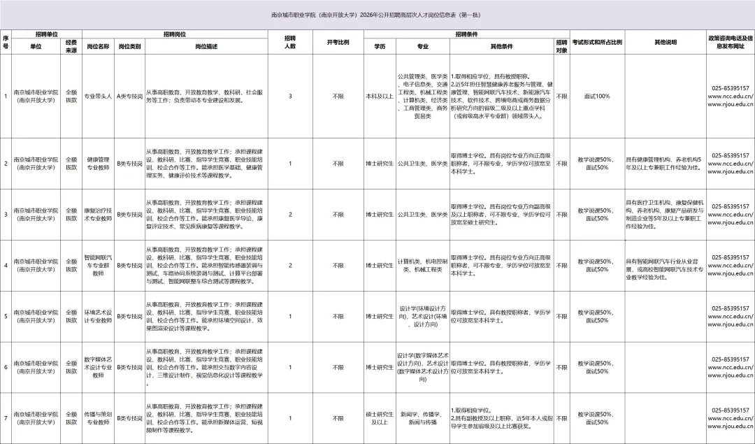 本次招聘相关信息在南京市人力资源和社会保障局网站(http://rsj.nanjing.gov.cn)、南京城市职业学院网站(http://www.ncc.edu.cn)和南京开放大学网站(http://www.njou.edu.cn)发布,具体的招聘岗位、数量、资格条件等详见附件1《南京城市职业学院(南京开放大学)2026年公开招聘高层次人才岗位信息表(第一批)》(以下简称《岗位信息表(第一批)》)。