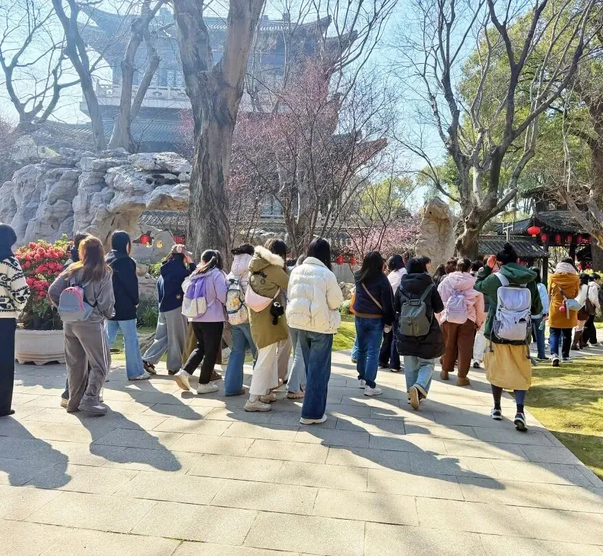 上午,研学团队抵达扬州涵碧园景区,在导游引导下有序入园。园内春光浸润,青石小径蜿蜒,亭台楼阁错落有致,学员们漫步其间,沉浸式感受春日园林景致。