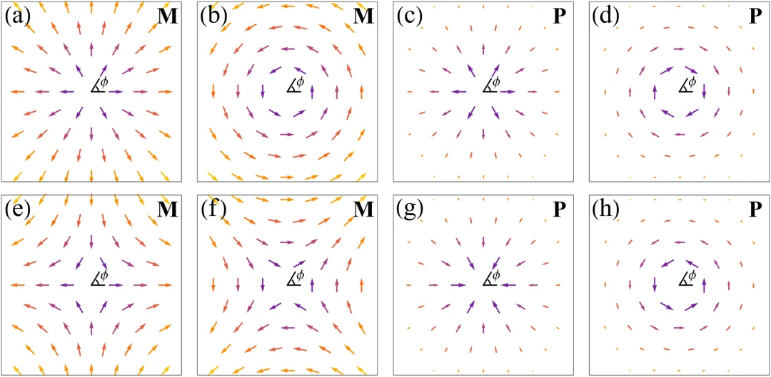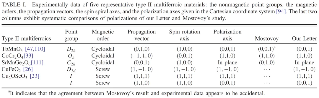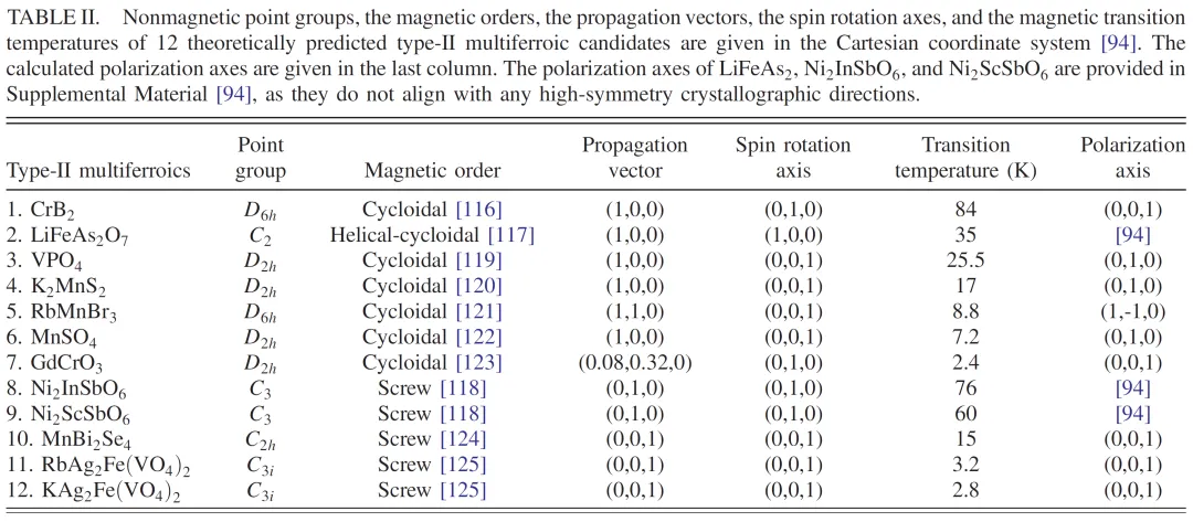 对称性分析为理解第二类多铁性材料中的磁电耦合效应提供了重要依据。在此研究中,作者通过朗道唯象理论系统研究了所有32种非磁性点群中电极化与非均匀磁化之间的耦合关系。该理论成功解释了所有已知非公度磁序第二类多铁性材料中的铁电极化现象。此外,通过对MAGNDATA数据库的系统筛选,研究预测出12种潜在的第二类多铁性材料候选体系,其中最高磁转变温度可达84 K。此外,研究发现共线正弦型自旋排布可成为铁电极化的全新来源。研究进一步证实,在单轴点群中,铁磁涡旋构型能够诱导产生拓扑铁电涡旋态,这为在多铁性材料中实现多重涡旋态共存开辟了新途径。